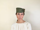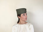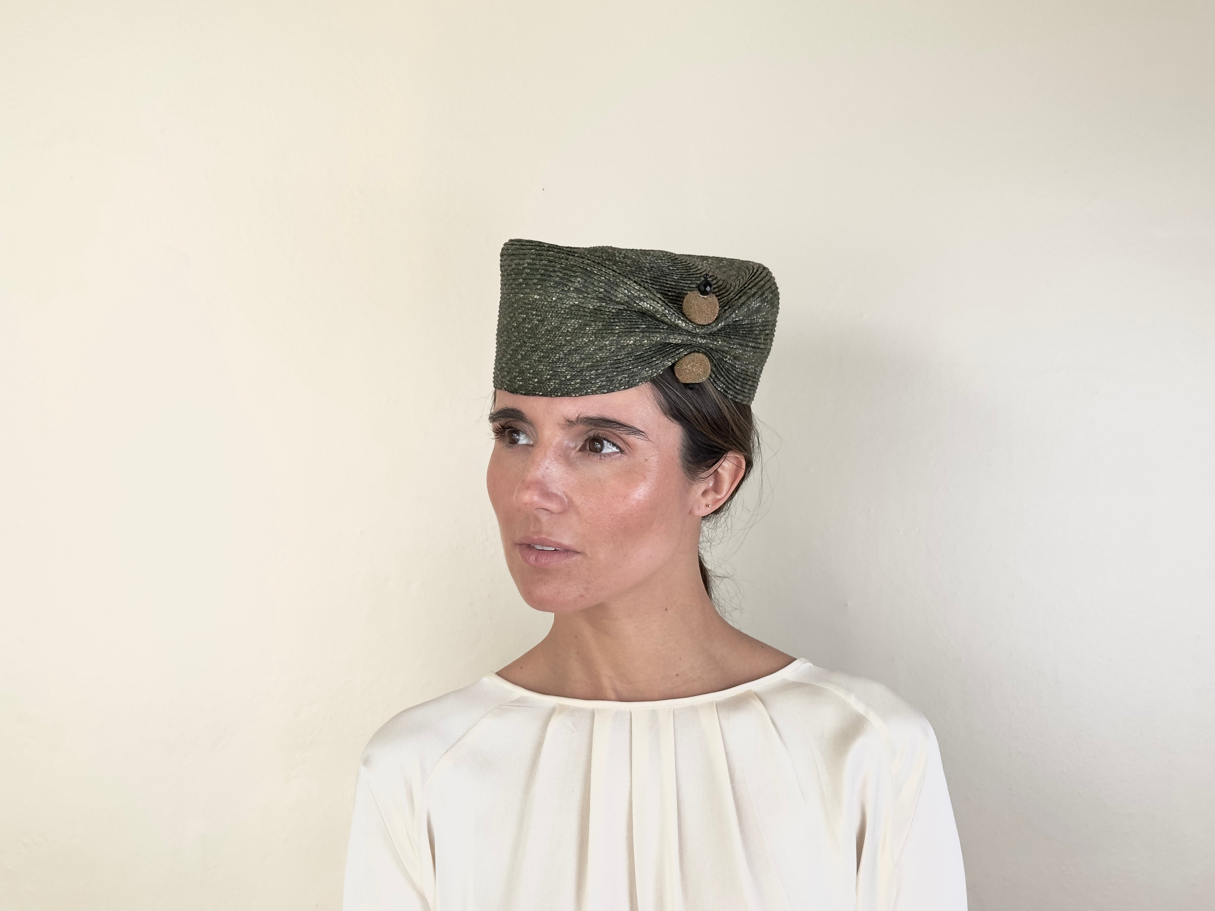 Tocado pillbox de paja de trigo trenzada y cosida color verde decorado con aplicación de piedras.