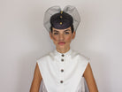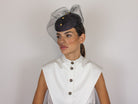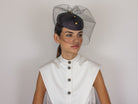Navy blue parasisal headdress decorated with gold buttons and veil.