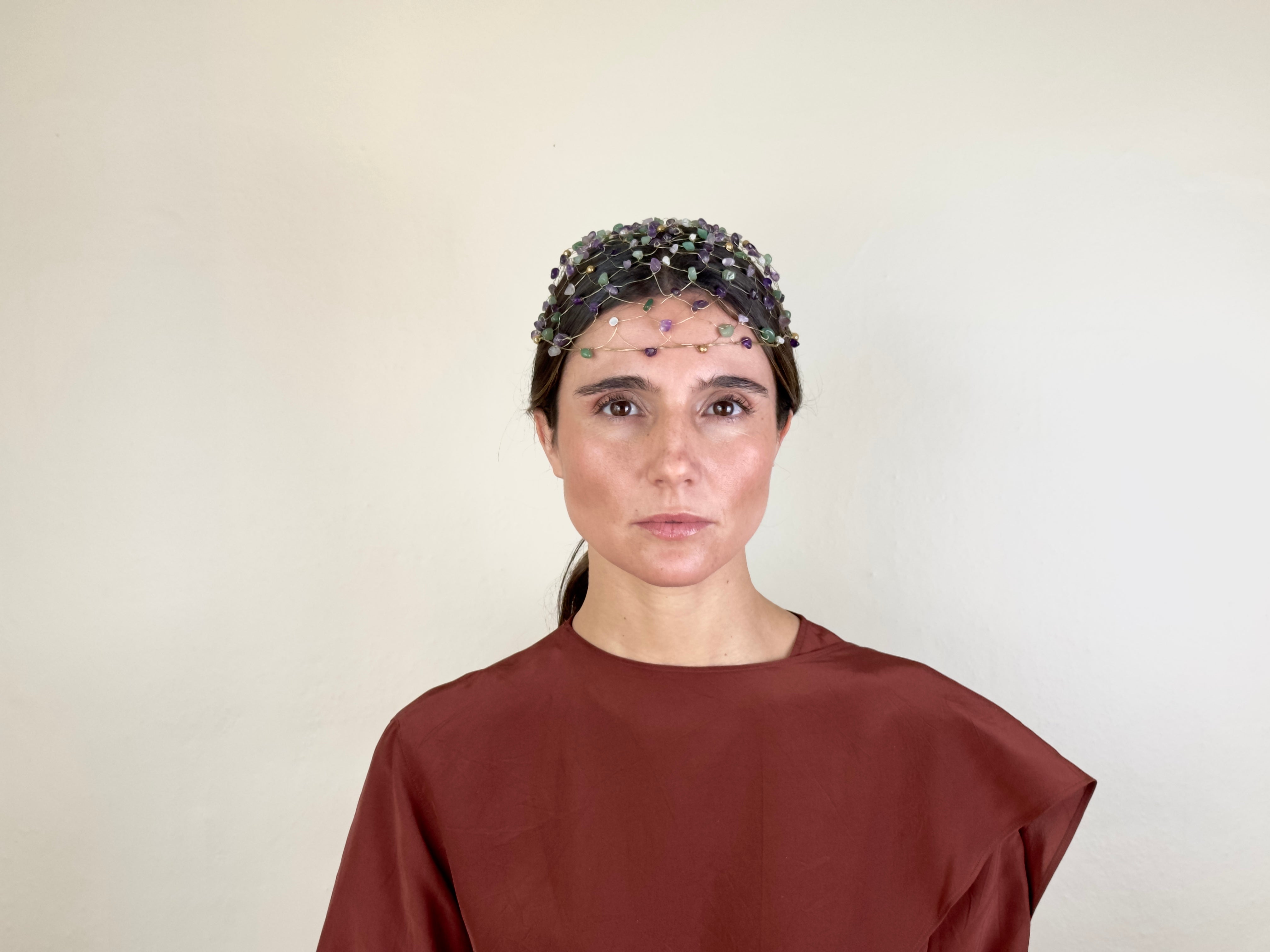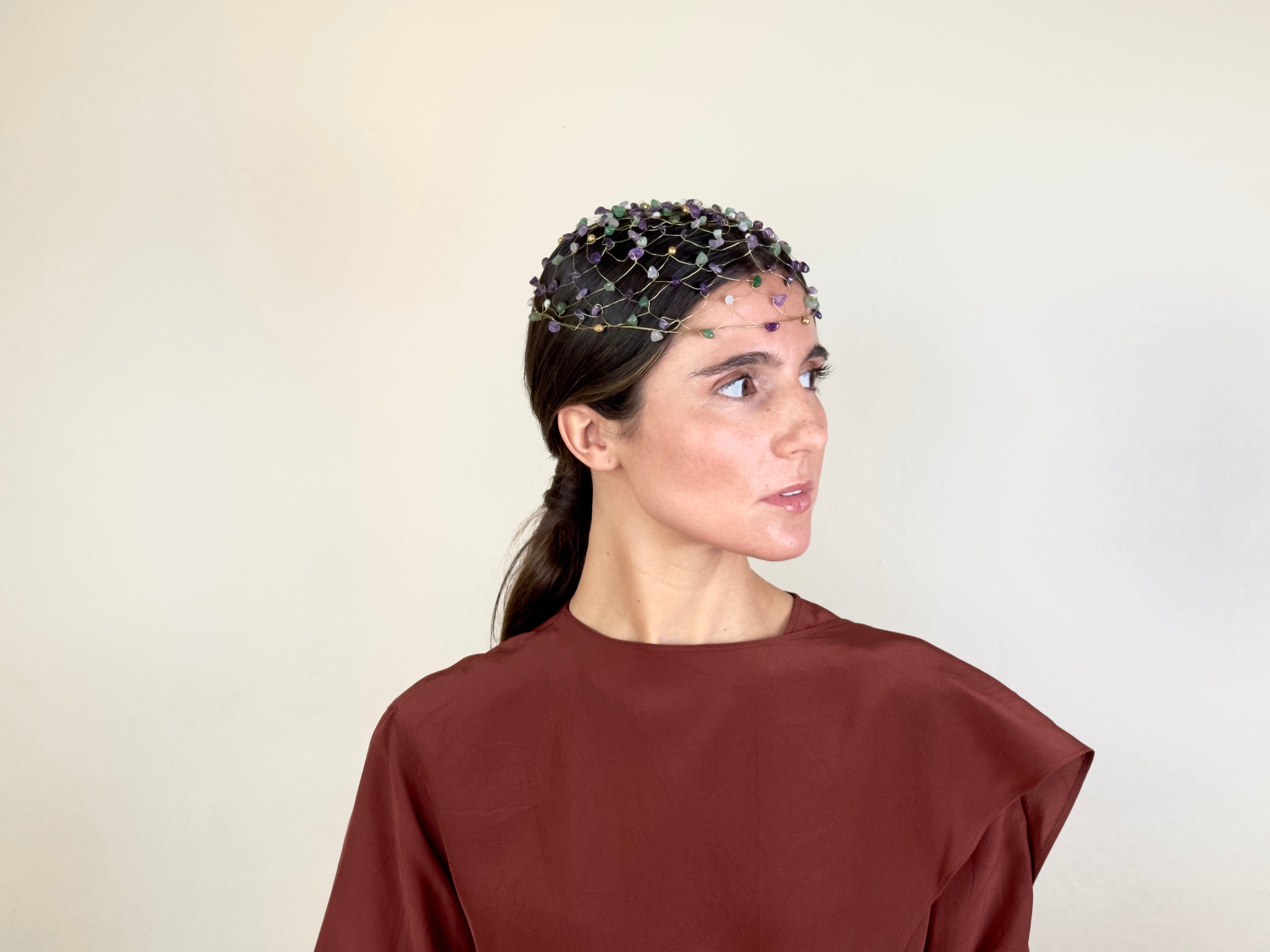 Casquete de piedras naturales verde y morada, piedras facetadas doradas y perlas.