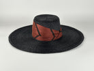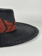 Premium quality 4/5 mm braided wheat straw hat with a burgundy and black painted wild silk ribbon appliqué. Straight crown and wide brim. The crown is slightly narrower at the top, creating a flattering shape for any face shape.