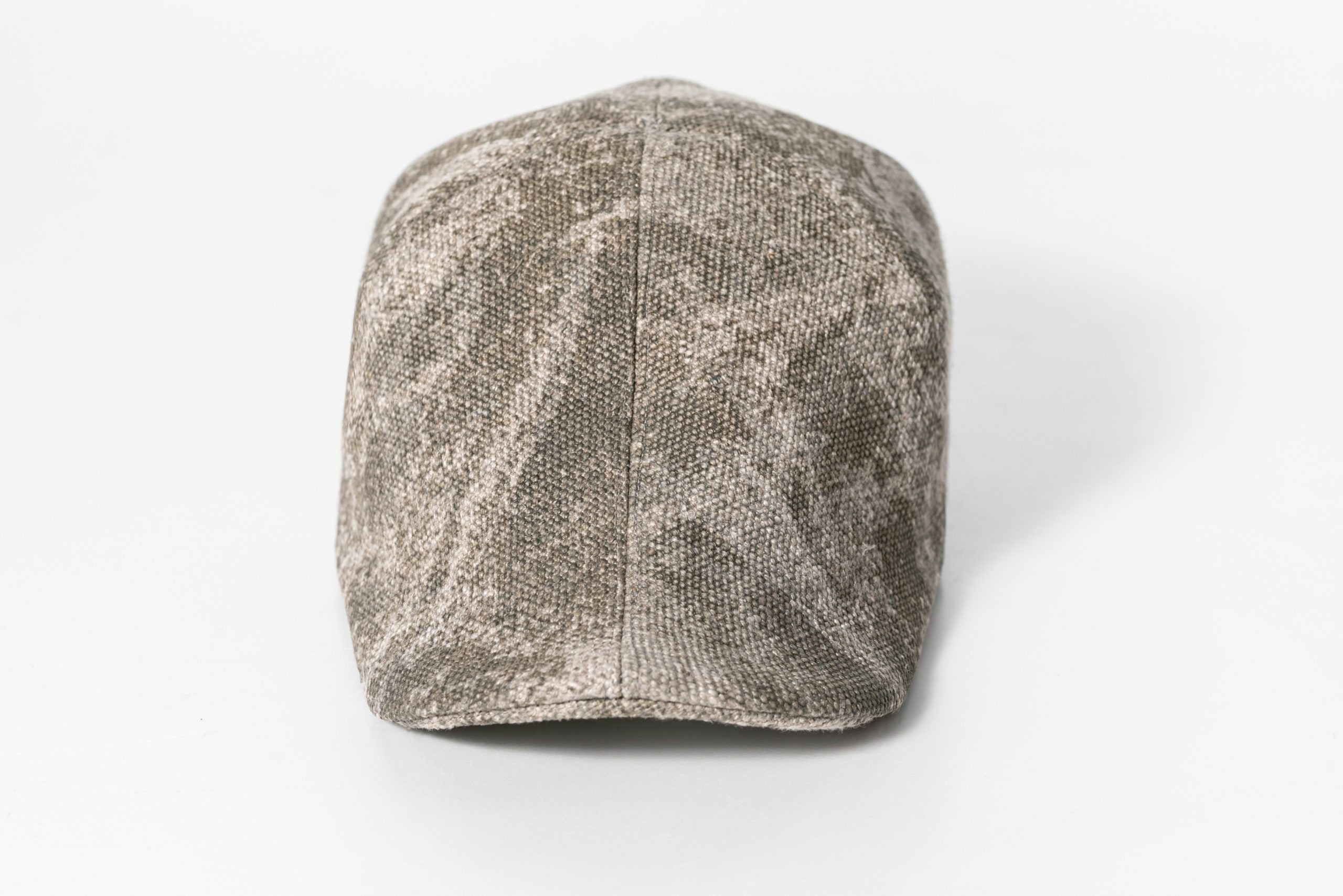 English cap made of cotton and linen with a green print. Lined with organic cotton.