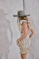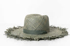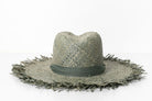 An original version of the dry green fedora hat with a wide, fringed brim. It features a matching cotton ribbon that allows you to tie it to protect you from the wind. It can also be worn across your back for added comfort when you want to wear it when not in use.