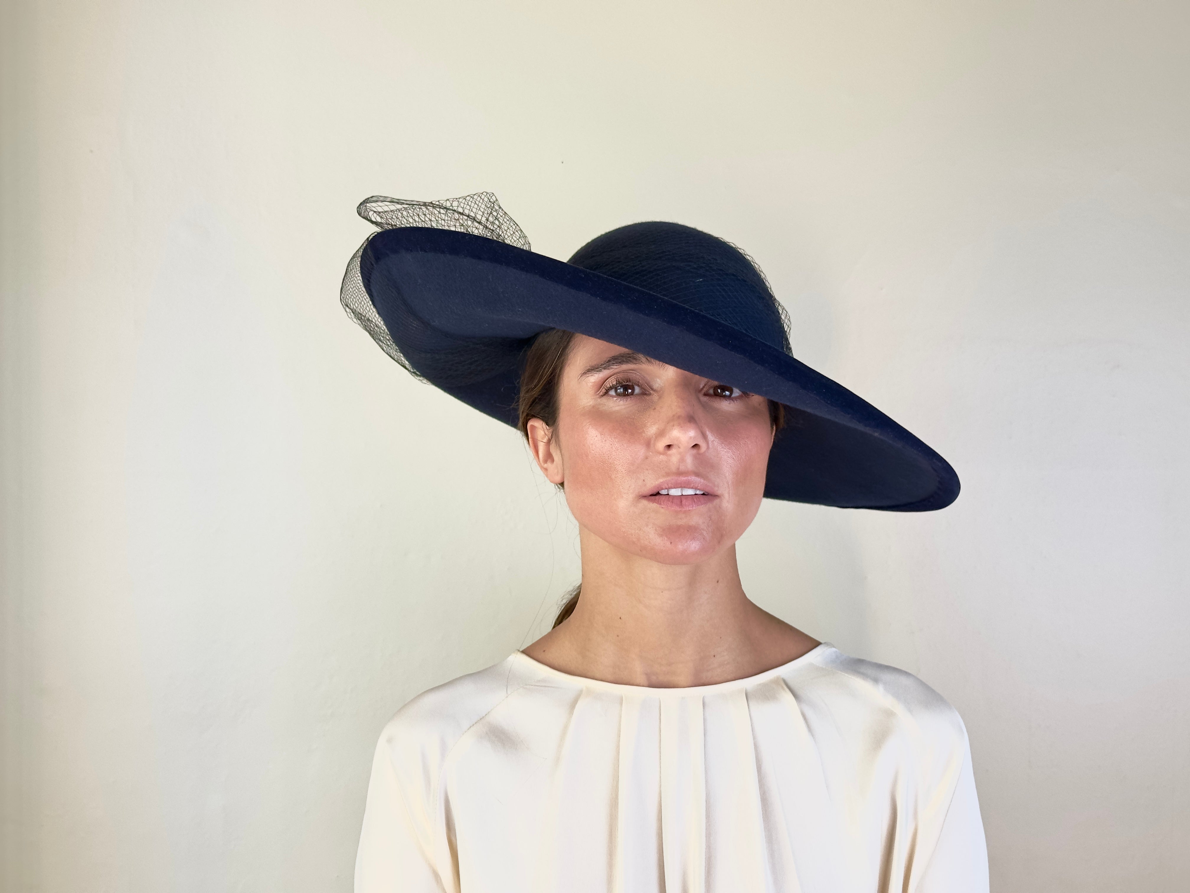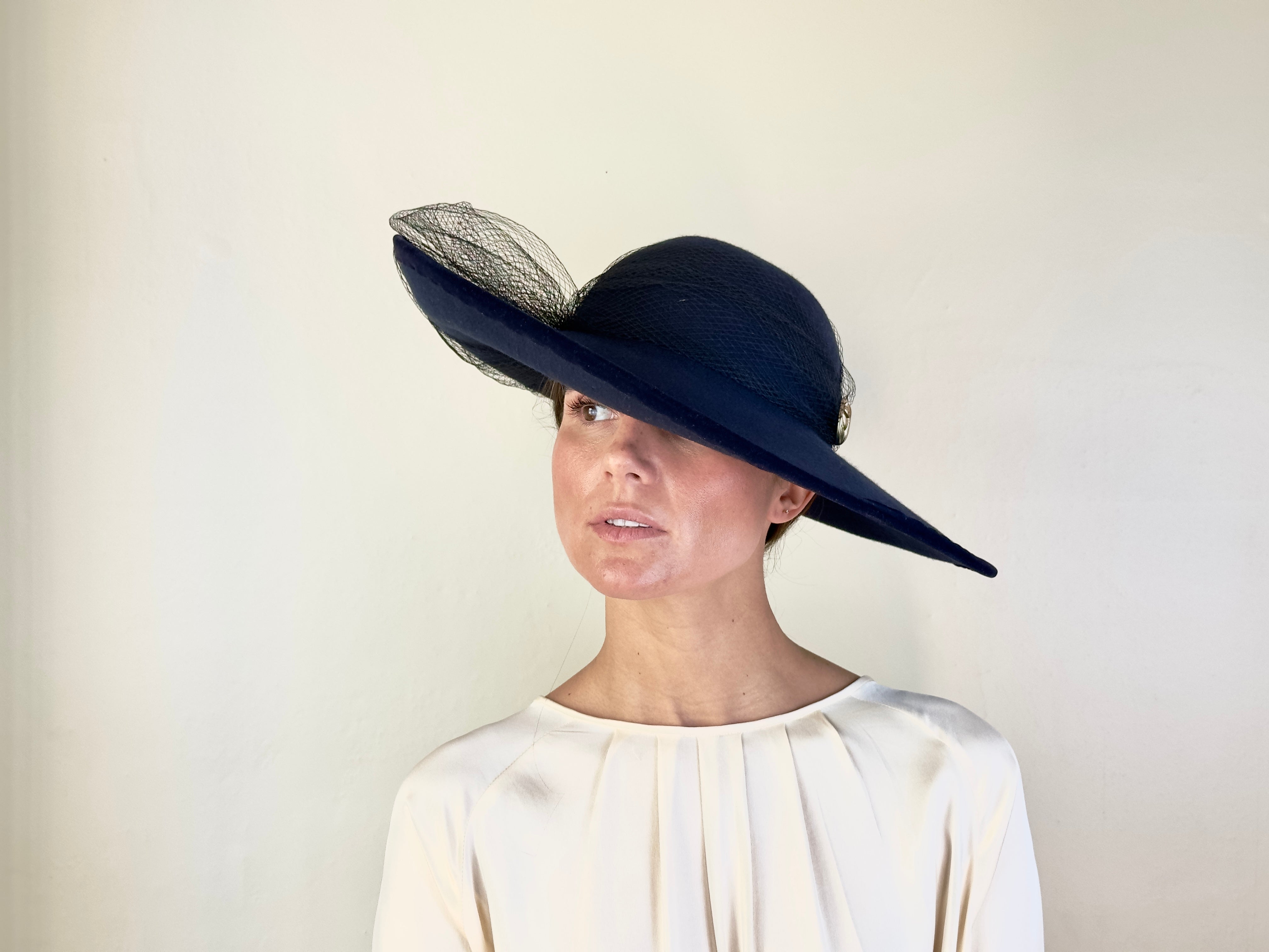 Navy blue felt hat with velour trim, button, and veil. Diameter: 43 cm. Crown height: 8 cm.