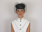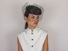 Black abaca and cotton cap decorated with a veil and fly appliqué.