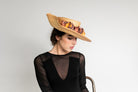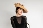 Peach-colored braided straw headdress decorated with curly feather flowers in mauve and burnt orange. Half-turned brim.