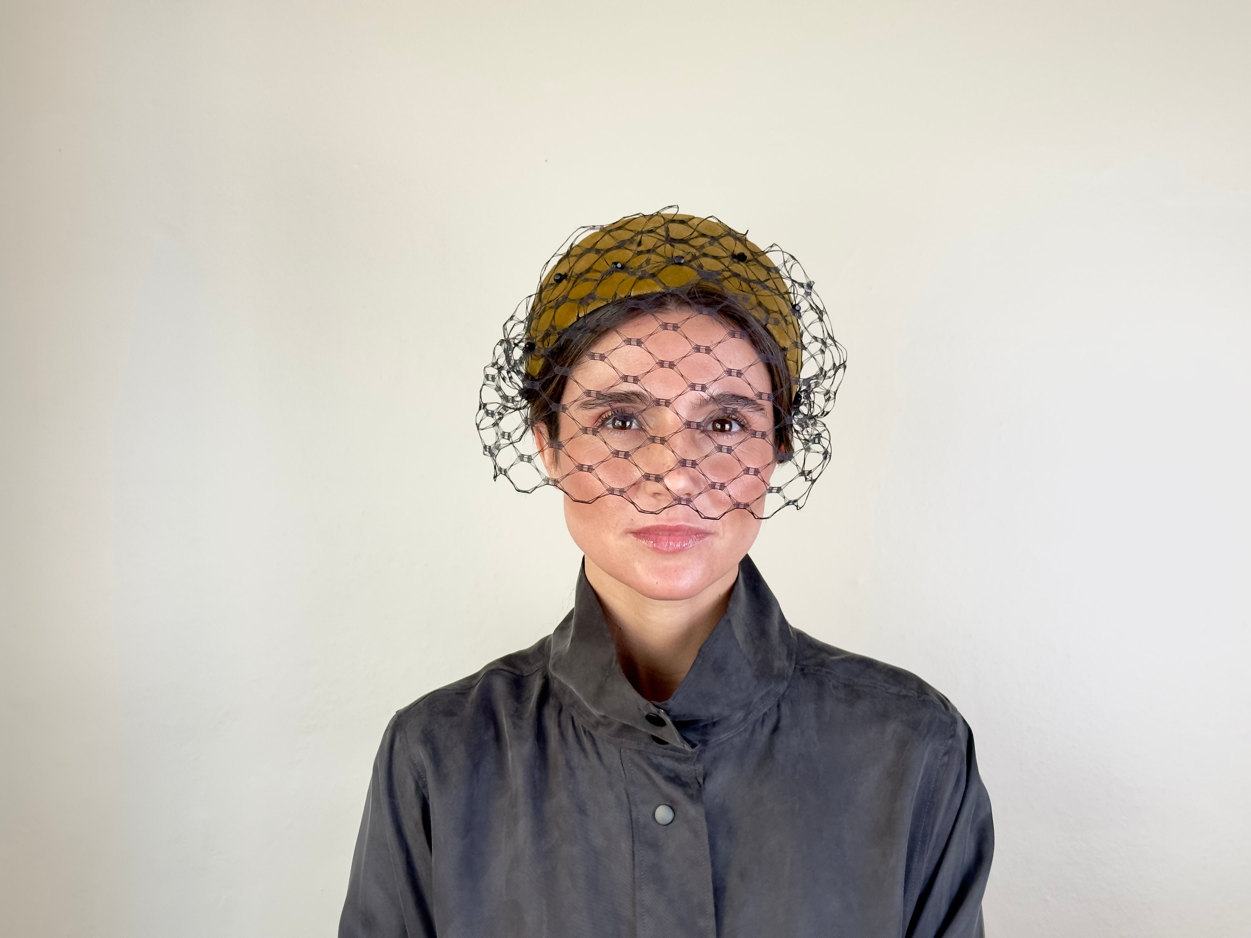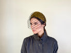 Diadema de terciopelo de algodón mostaza decorada con piedras facetadas negras y velo.