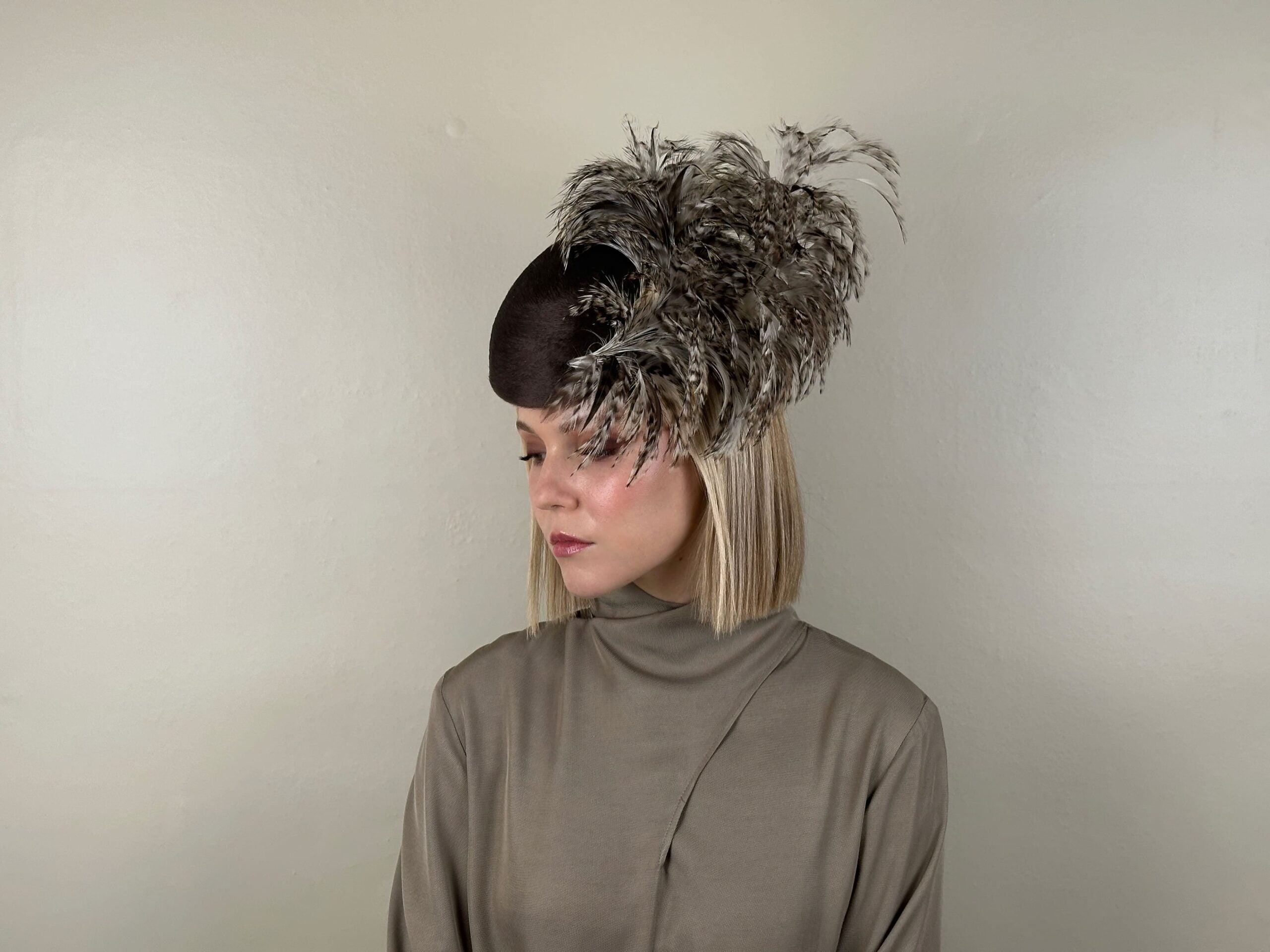 Brown fur felt cap headdress decorated with chinchilla rooster feathers.