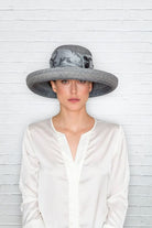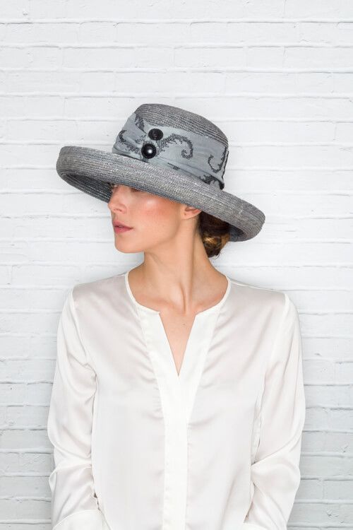 Grey sewn straw hat with embroidered silk and black button appliqués. Diameter: 36 cm. Crown height: 12 cm.