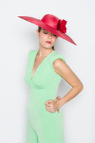 Red parasisal hat decorated with abaca, cotton, and velvet appliqués in various shades of red. Round crown.