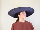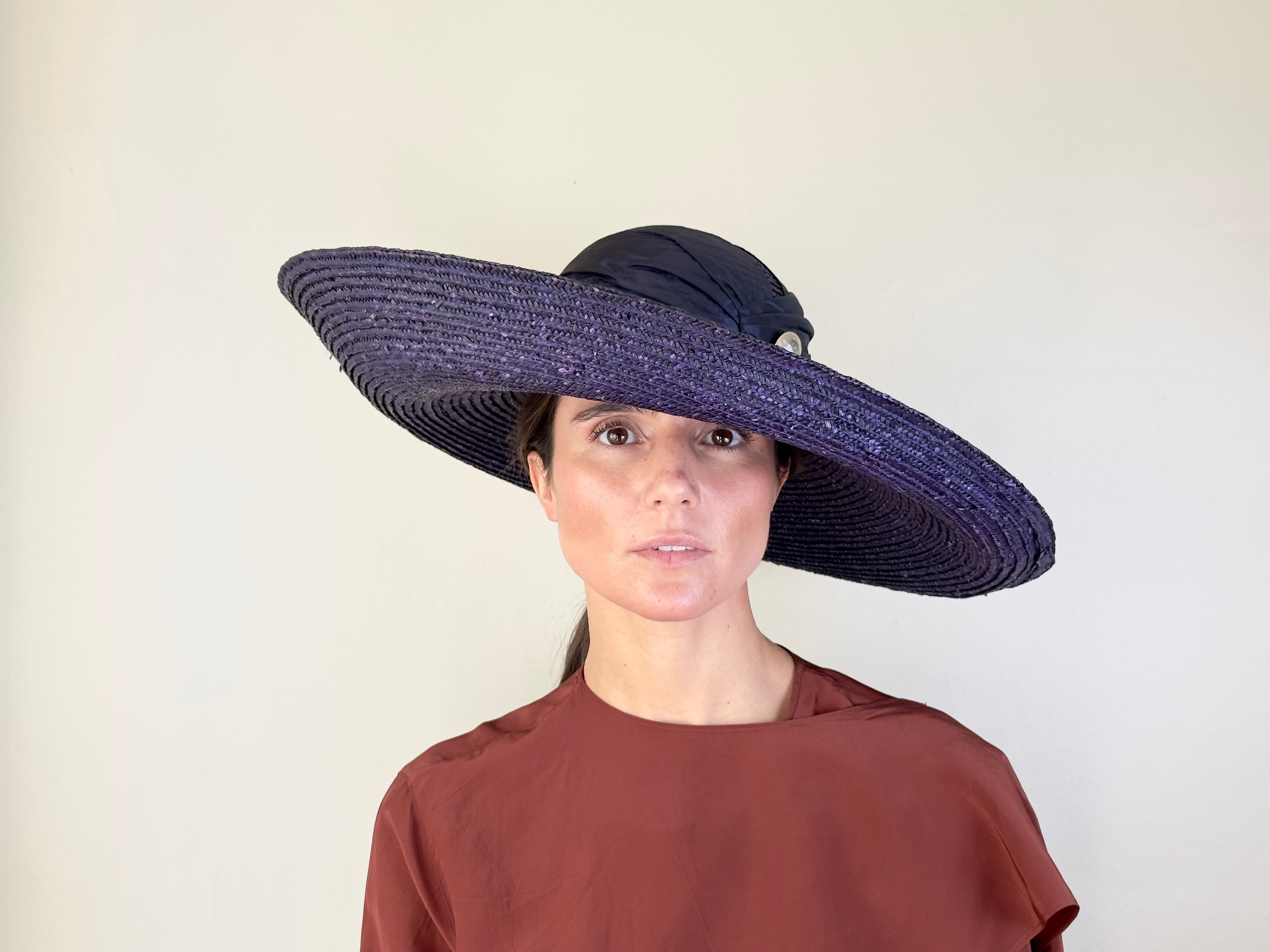 Blue braided straw hat decorated with matching wild silk and silver buttons.