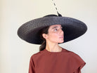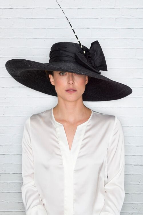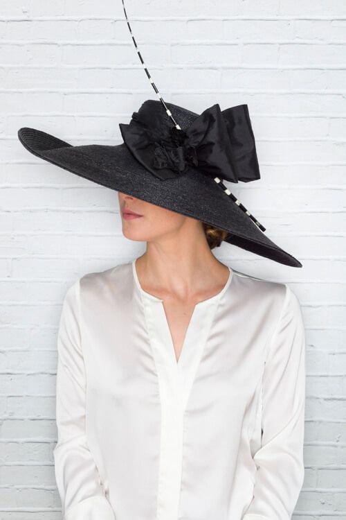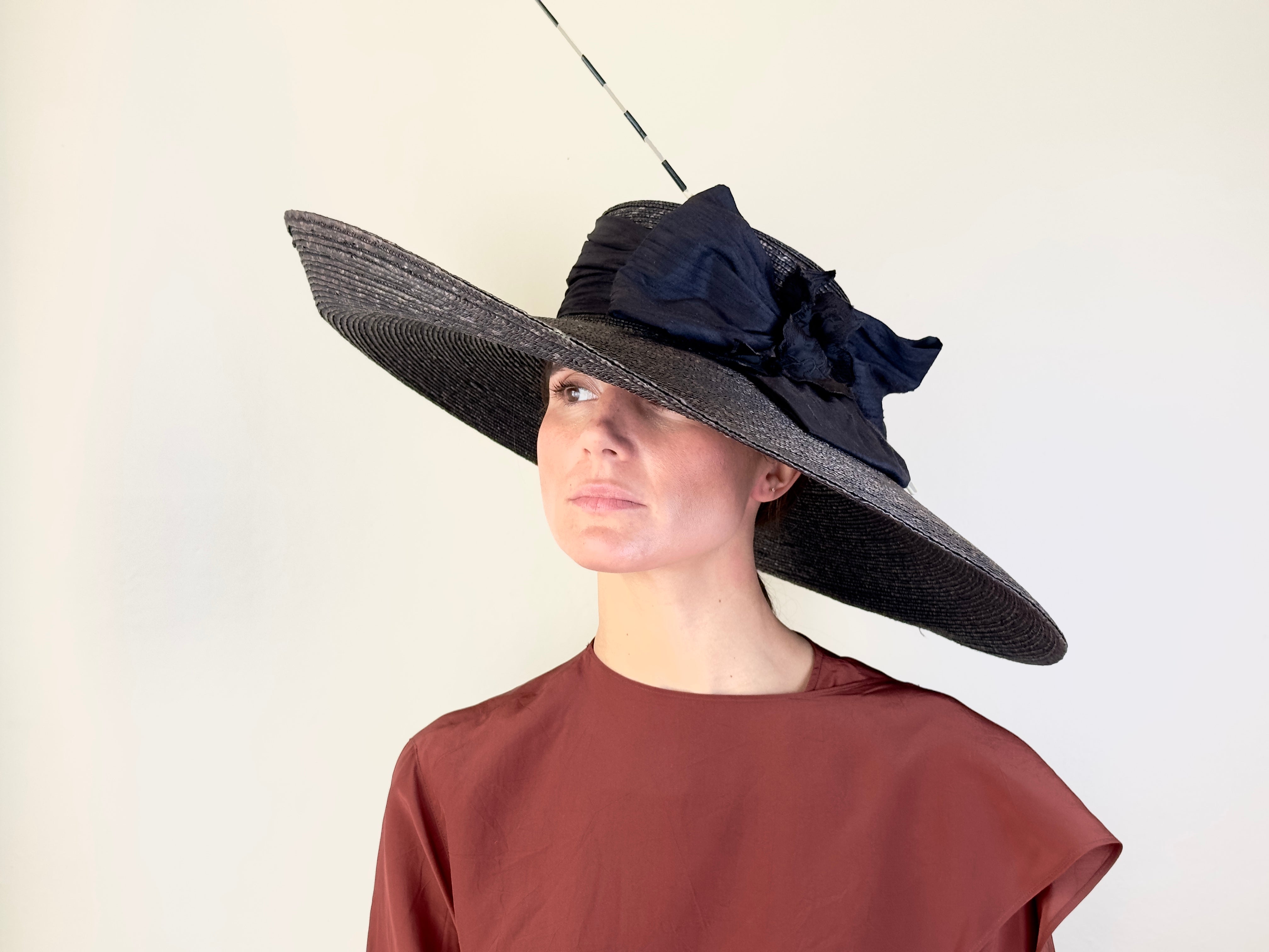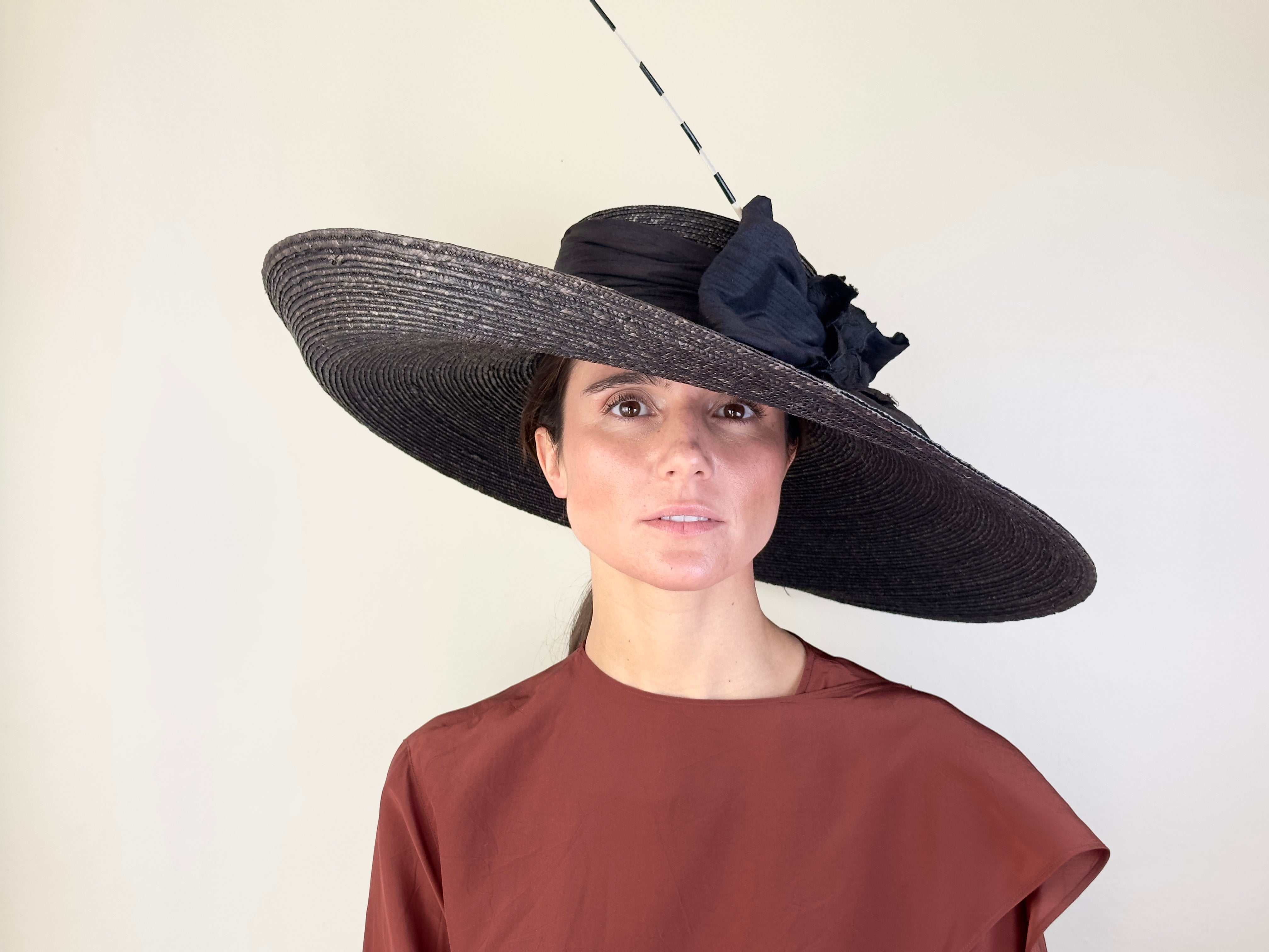 Black sewn straw hat with a double silk bow and a rachis. Diameter: 50 cm. Crown height: 9 cm.