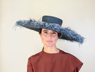 Blue gradient sewn straw hat. Flat crown with feathers and grosgrain ribbon. Diameter: 50 cm. Crown height: 10 cm.