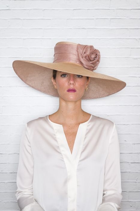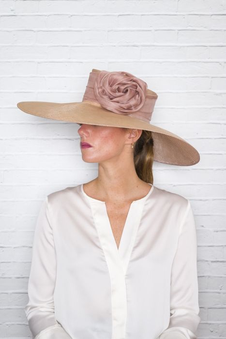 Pamela parasisal nude. Flat crown with silk organza rosette appliqué. Diameter: 50 cm. Crown height: 9.5 cm.