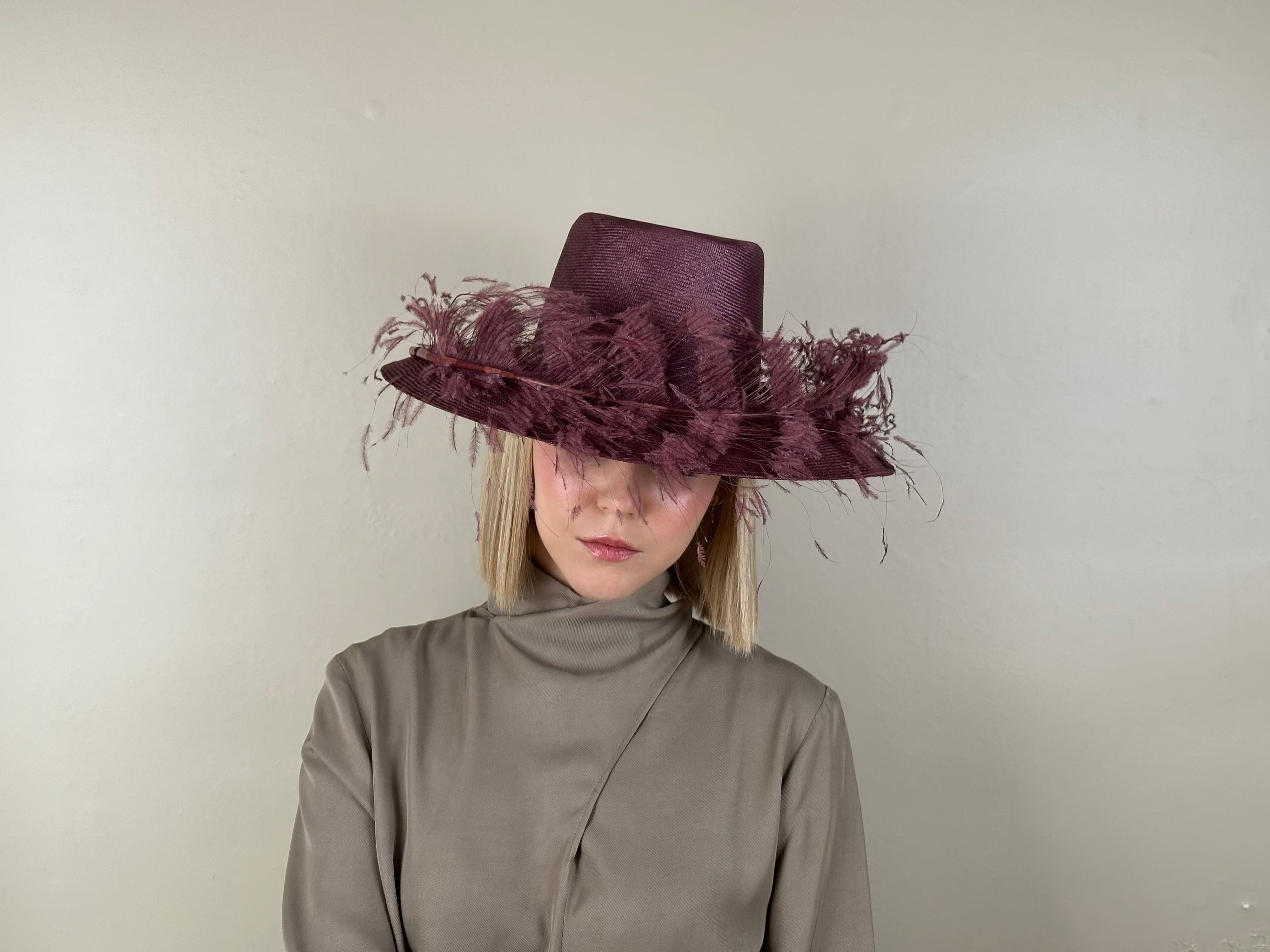 Aubergine-colored sisal hat with feather appliqué. Conical crown and low brim.