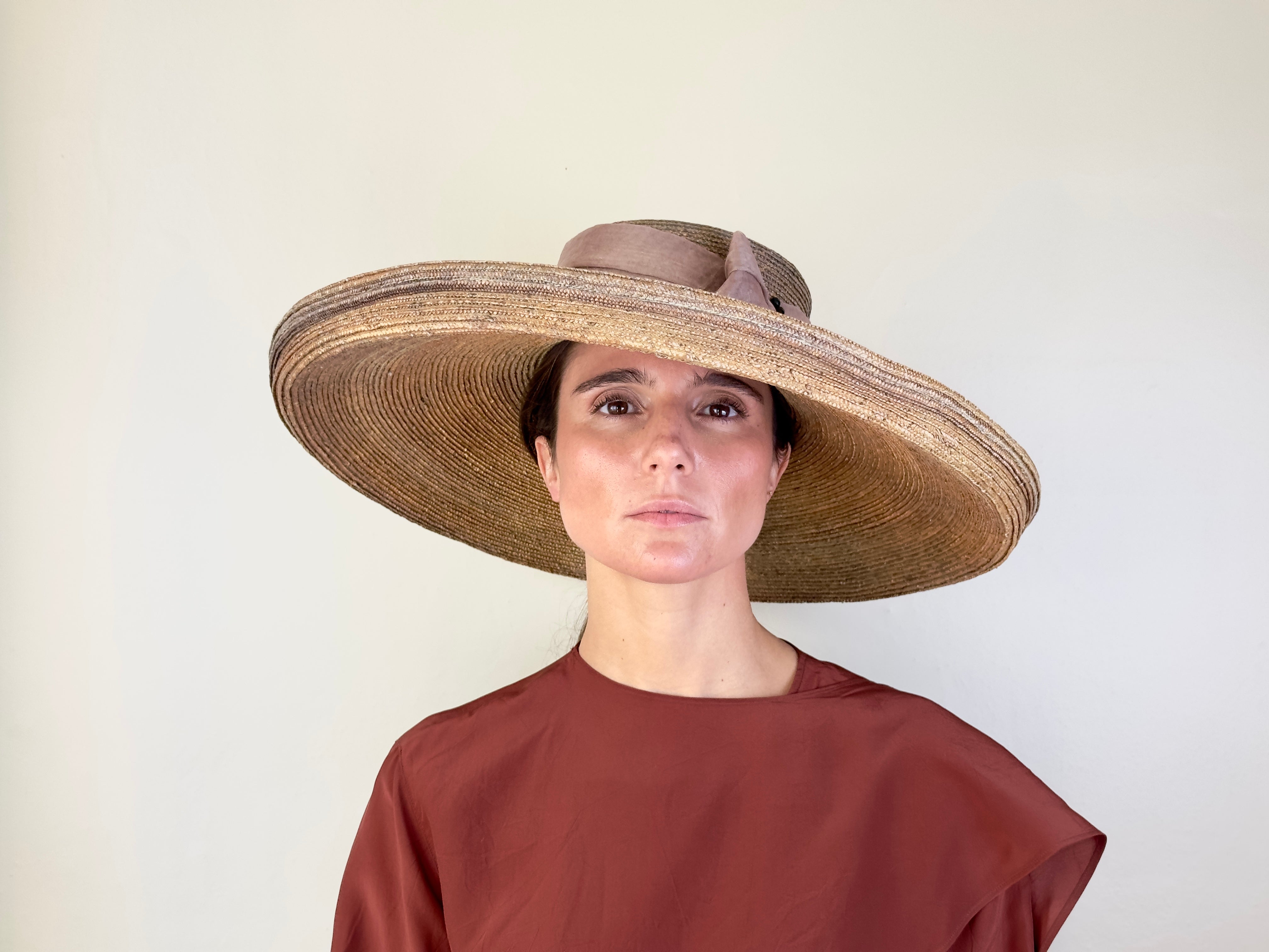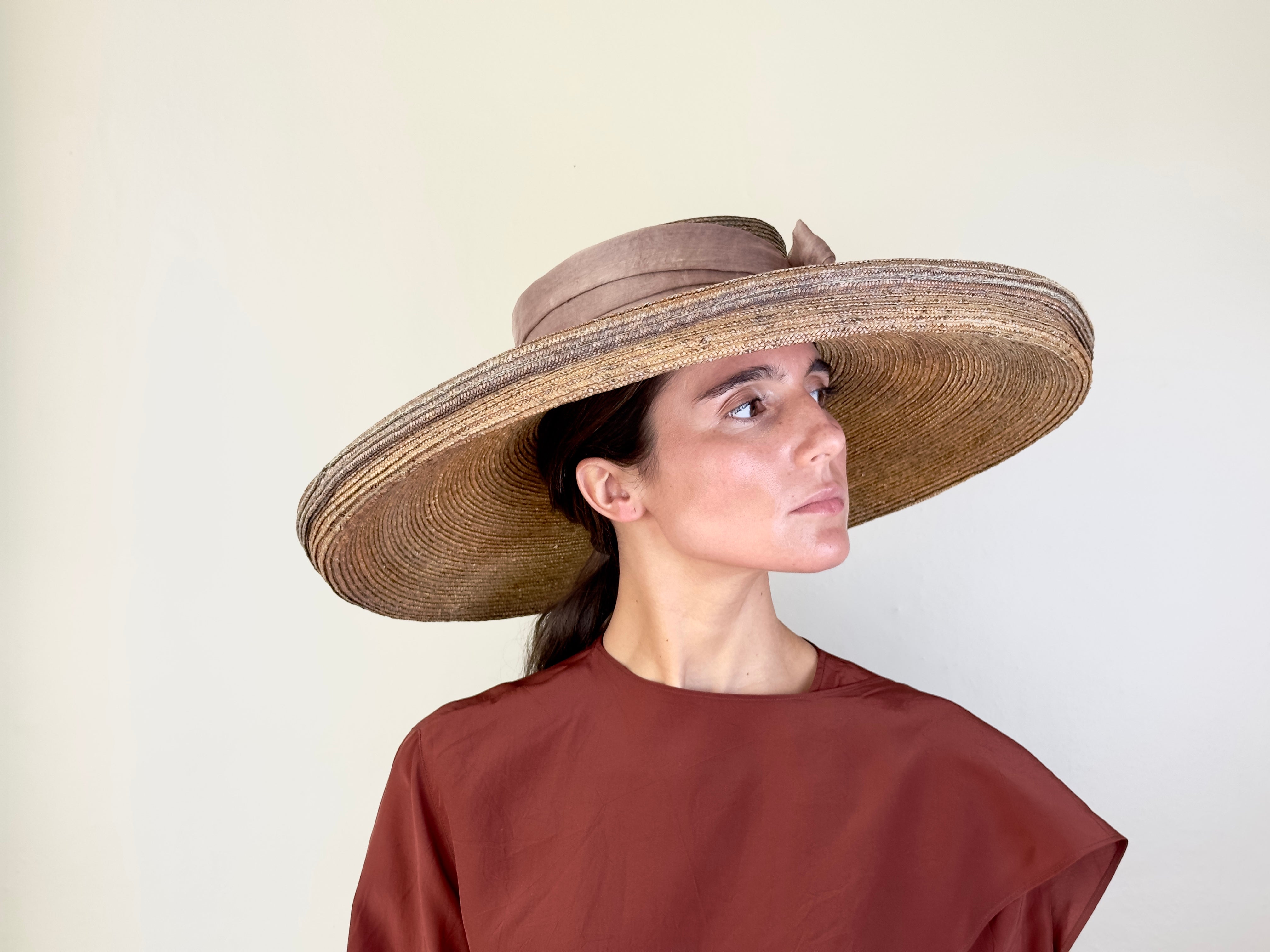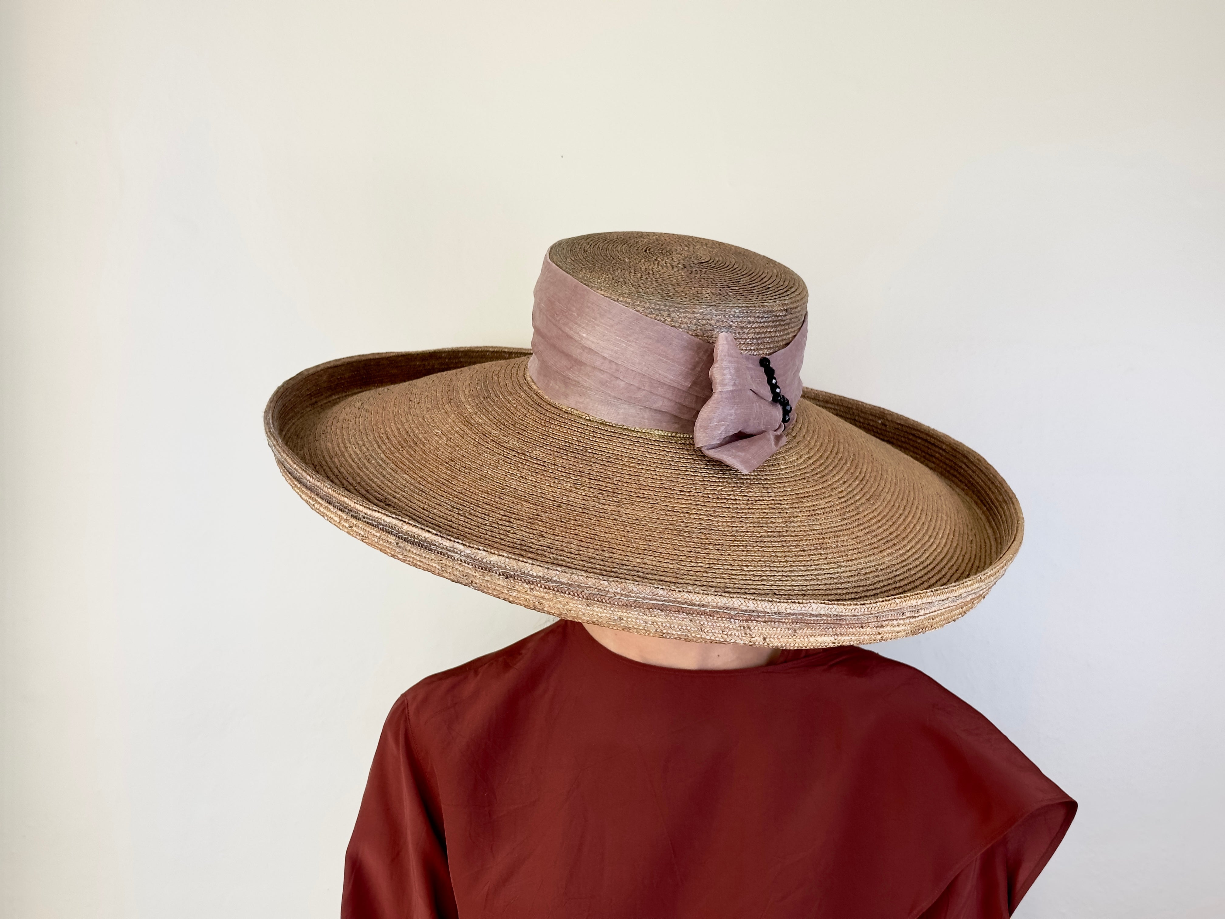 Bronze-colored sewn straw hat with silk appliqué and black stones. Diameter: 49 cm. Uneven crown height: 9 cm.