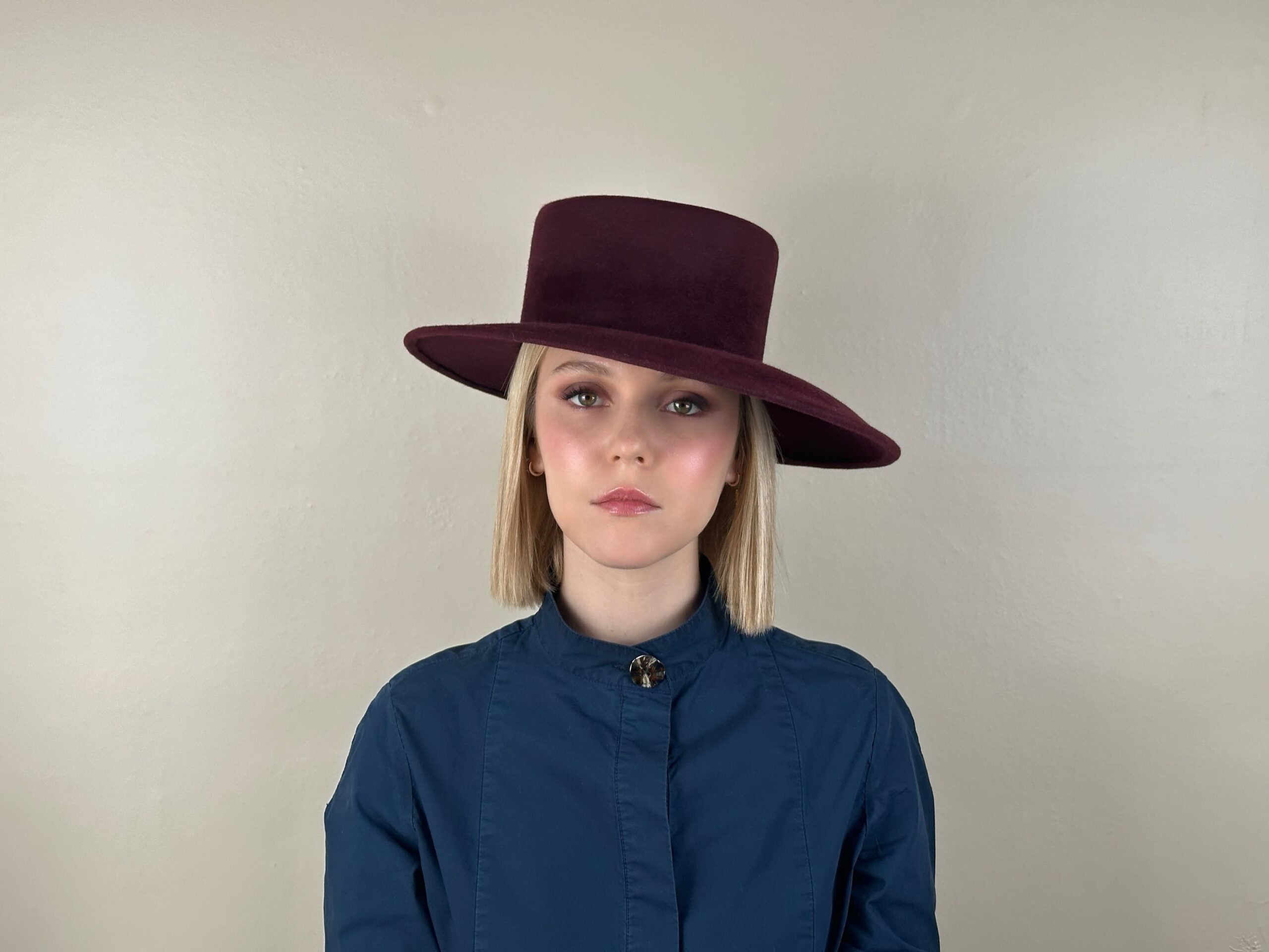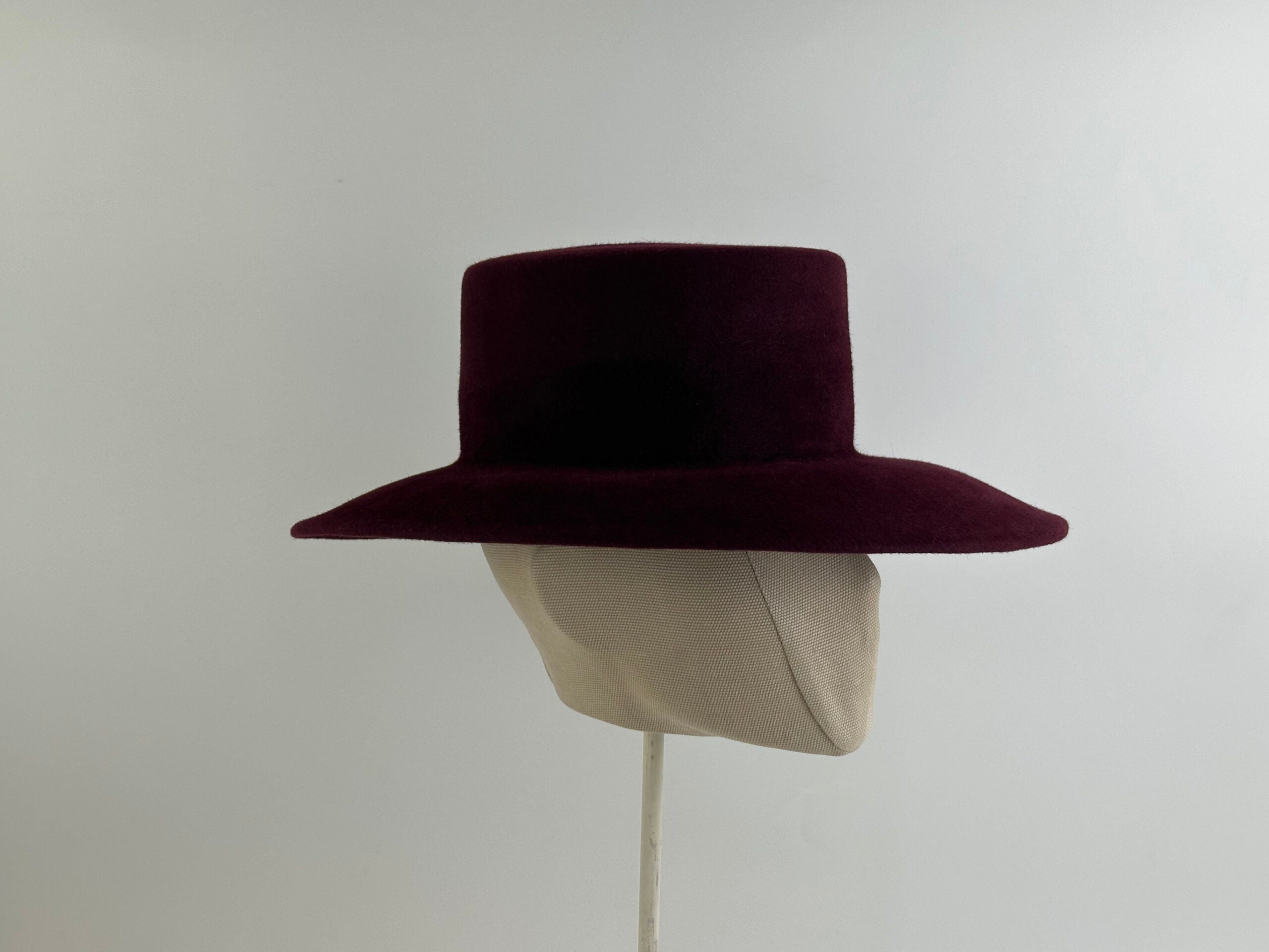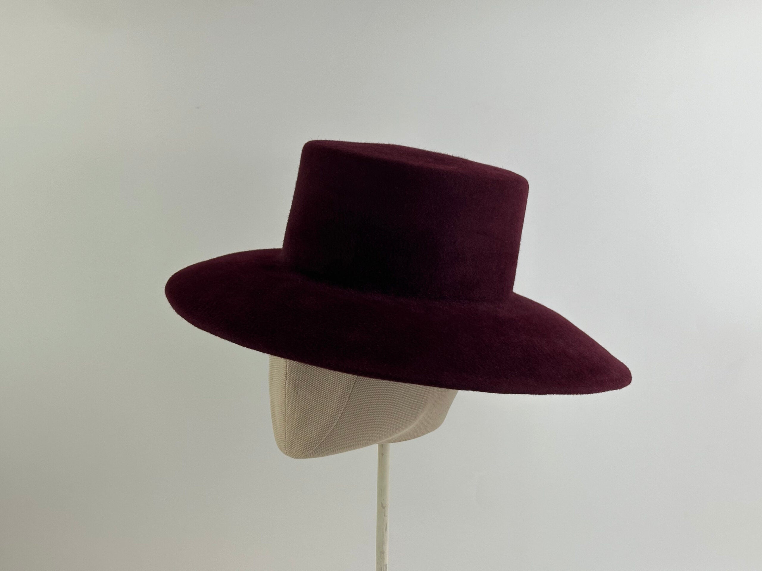 Burgundy fur felt hat with a velvety finish. Straight crown and asymmetrical brim.