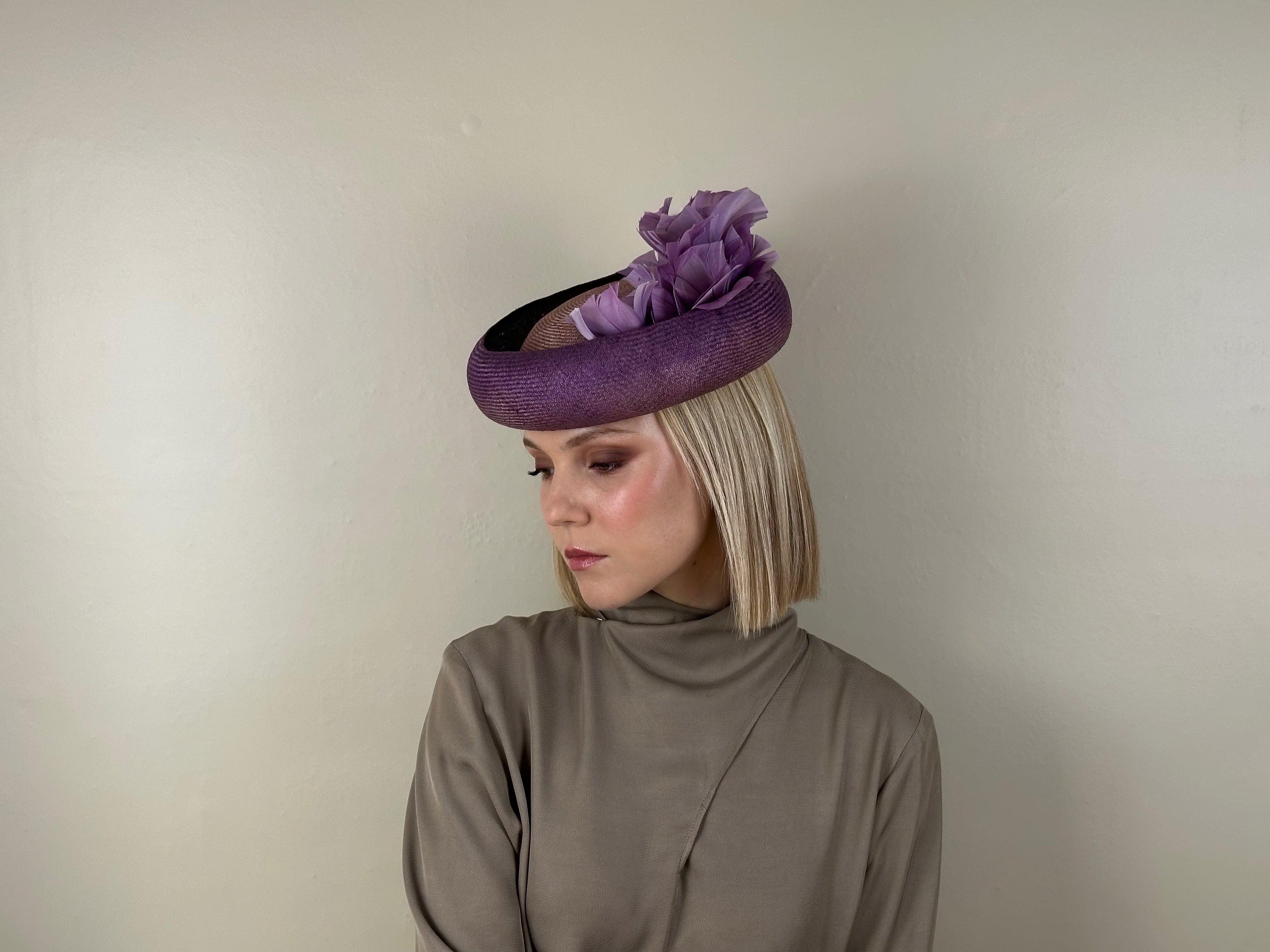 Mauve sisal headdress inspired by the Calañés hat. Decorated with feather flowers.
