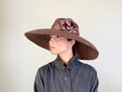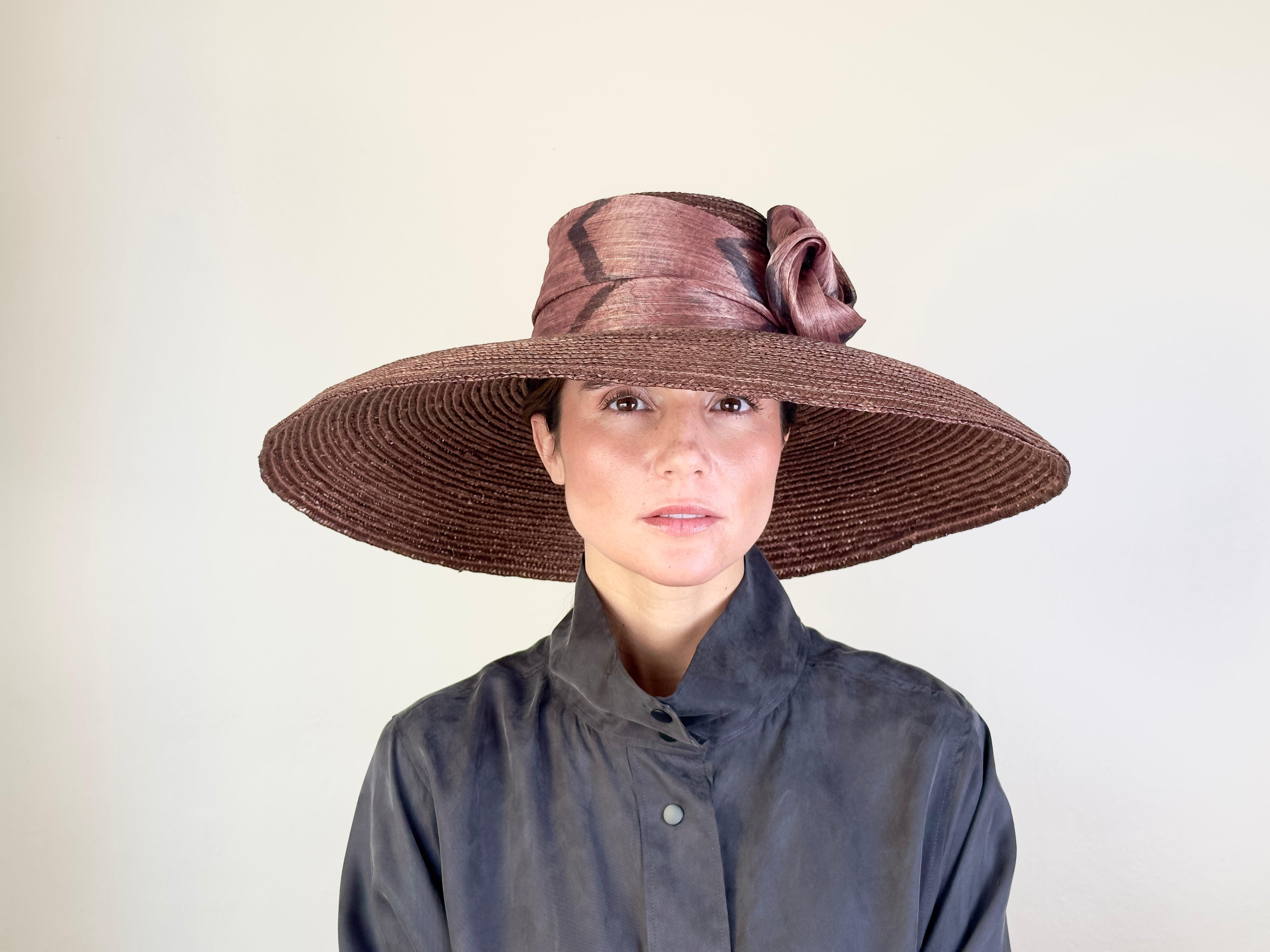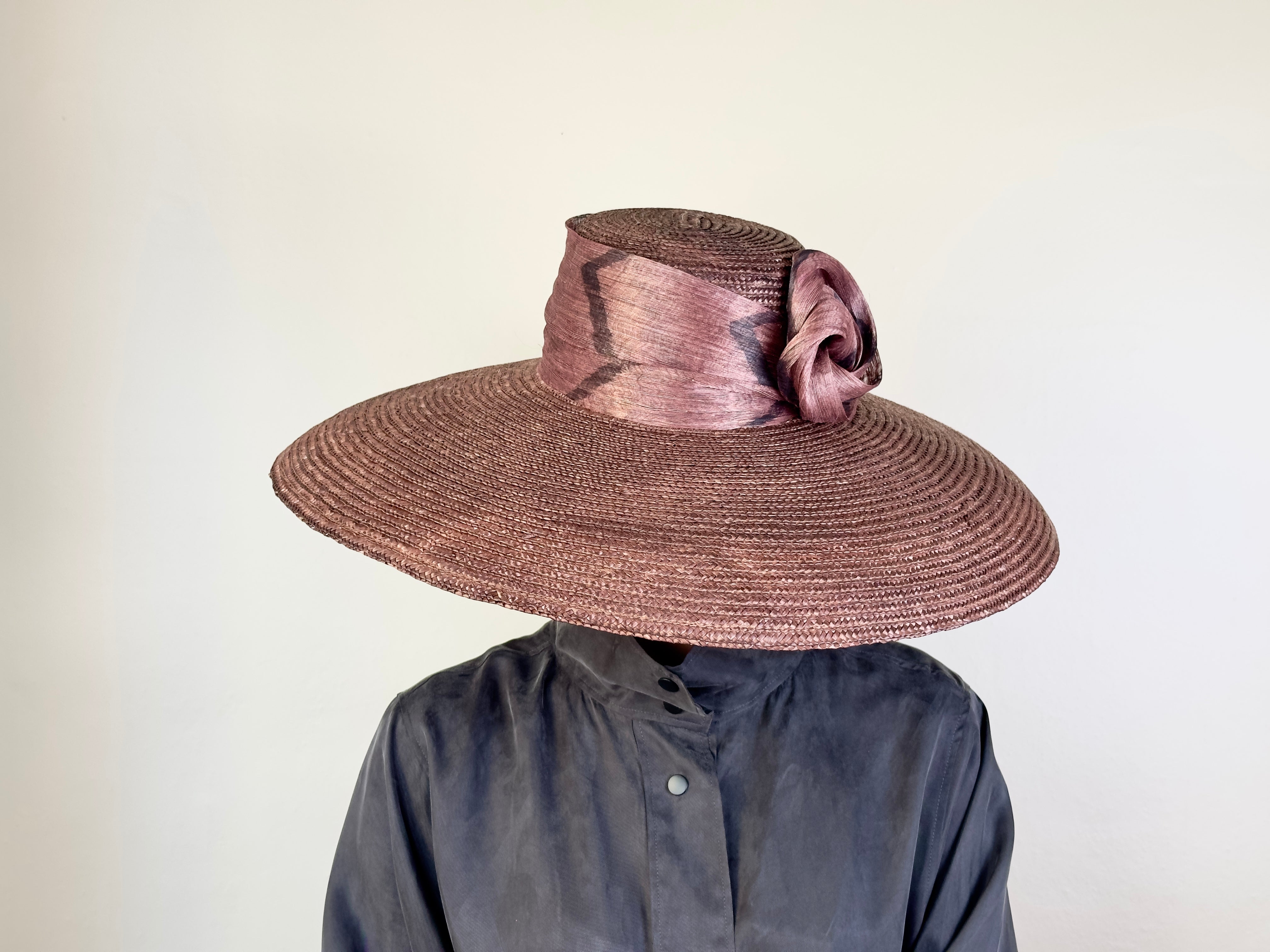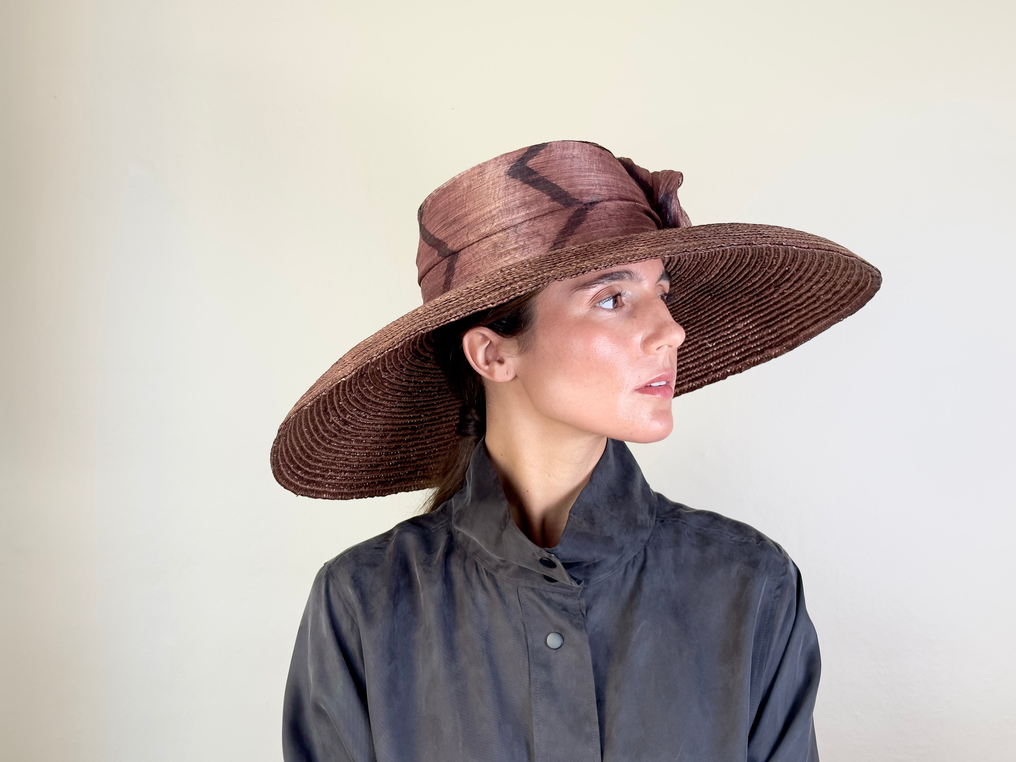 Pamela paja cosida en color marrón decorada con cinta de abacá y seda pintada al tono y negro y aplicación en el mismo material en forma de flor.
