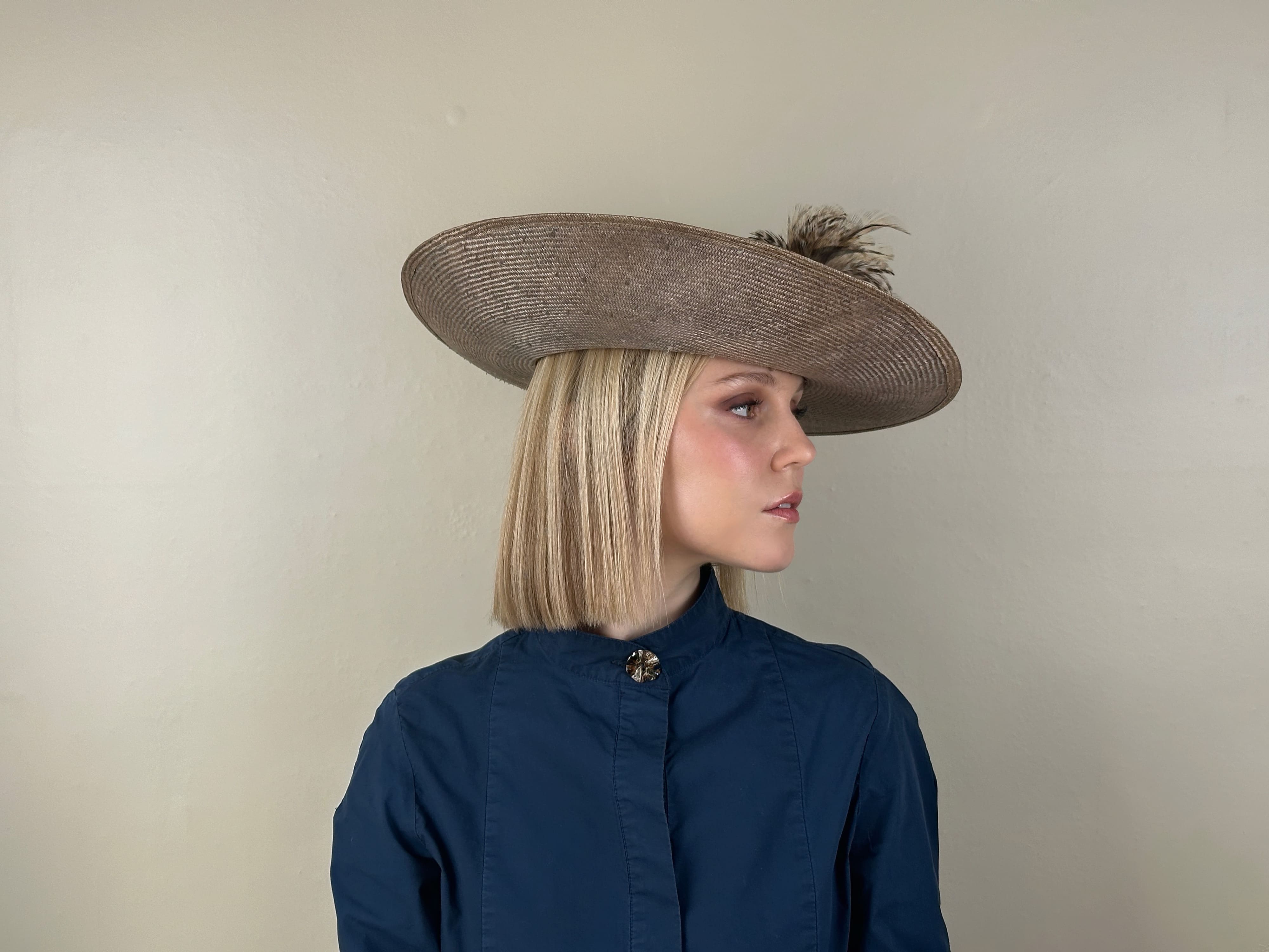 Gray sisal hat decorated with natural rooster feather appliqués. Conical crown with a half-turned brim.