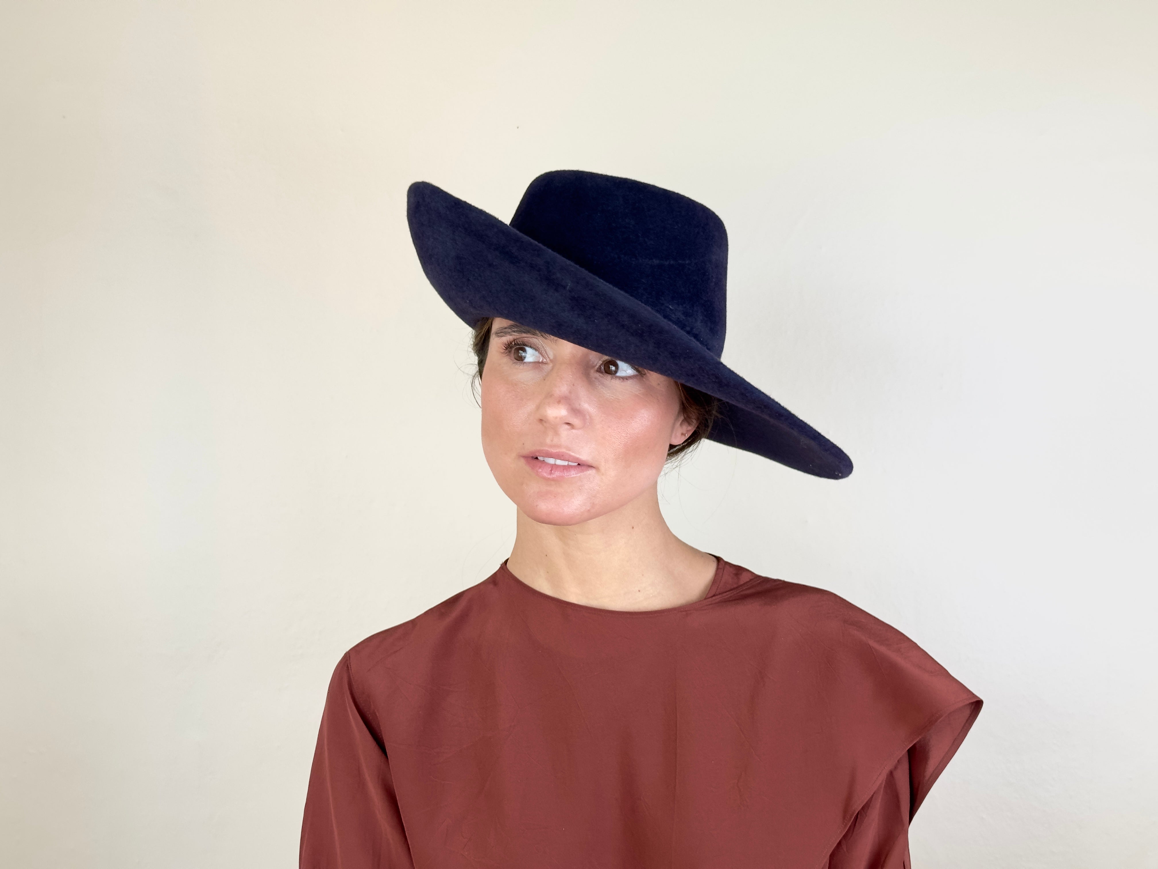 Sombrero de fieltro de pelo color azul marino. Copa cónica y media ala vuelta.