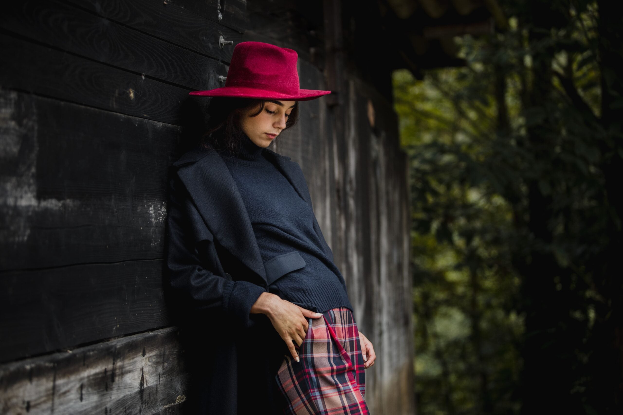 Fur felt fedora hat with a turned-up brim that enhances visibility and stylizes the figure by creating a diagonal visual effect. Handcrafted on a wooden frame.