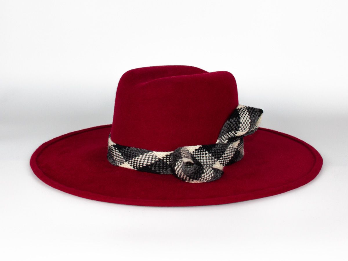 Handcrafted carmine-colored felt hat decorated with a vintage plaid merino wool ribbon. Velvety finish.