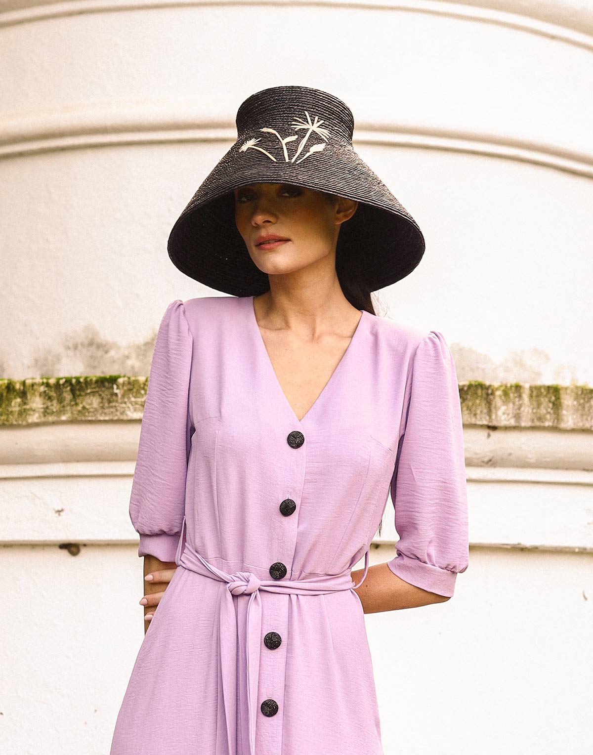 It's a simple and versatile hat that you can combine with any guest look or for other types of events. It's also ideal for protecting yourself from the sun on any spring or summer day. Its shape is simple yet elegant, and the material used makes it a high-quality hat perfect for a daytime wedding look.