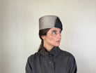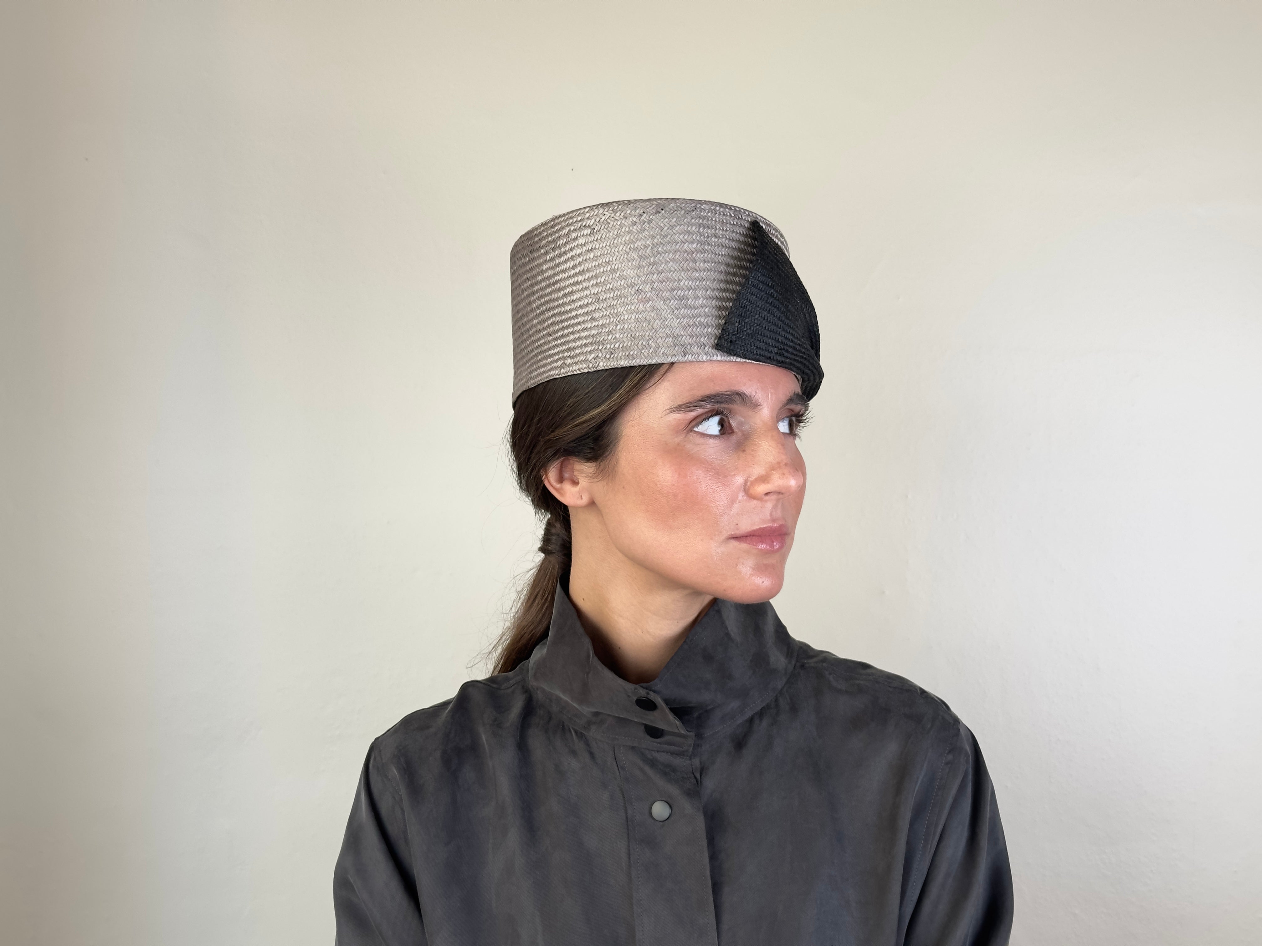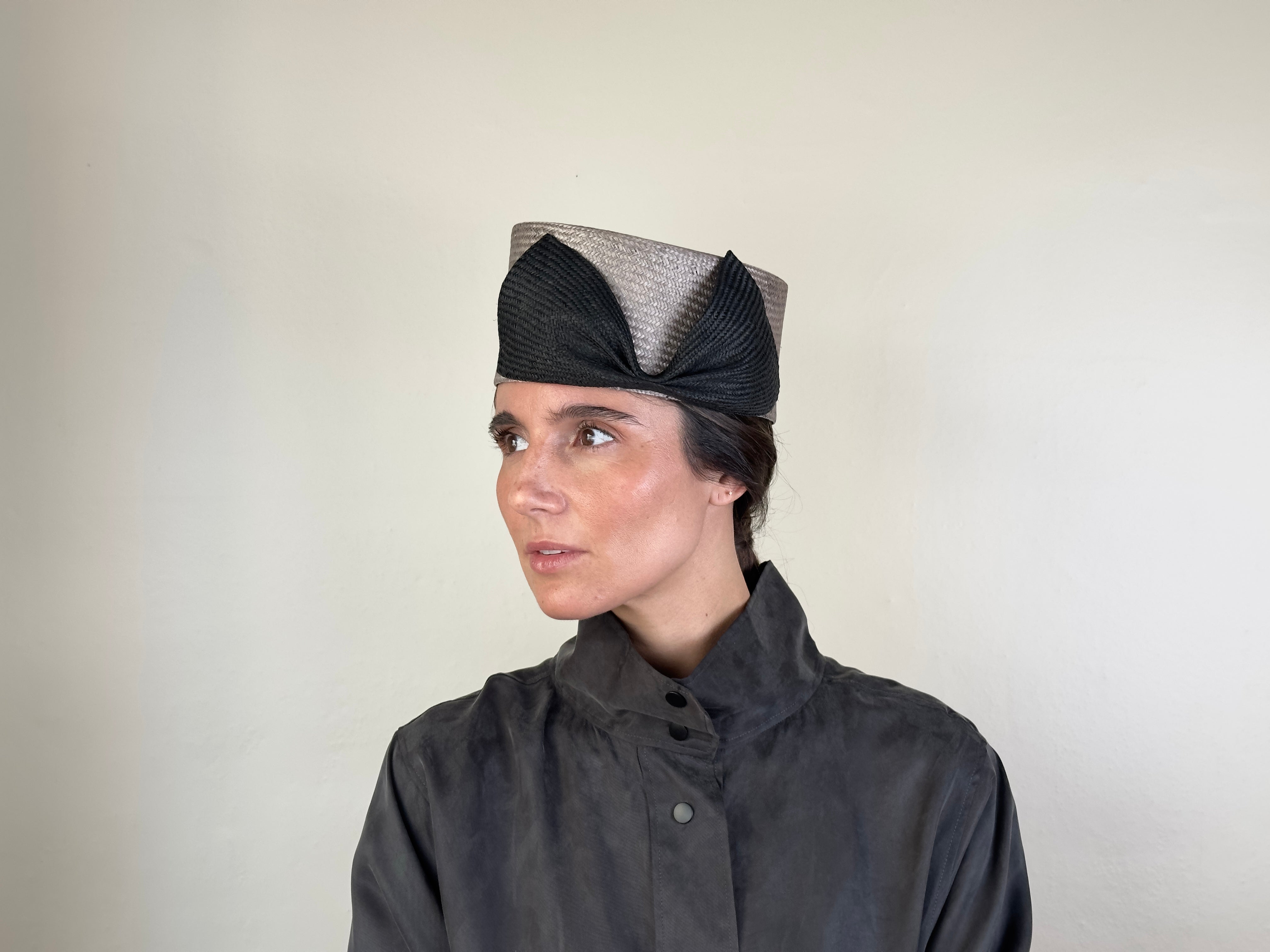 Casquete de sisal color gris decorado con lazo negro del mismo material.