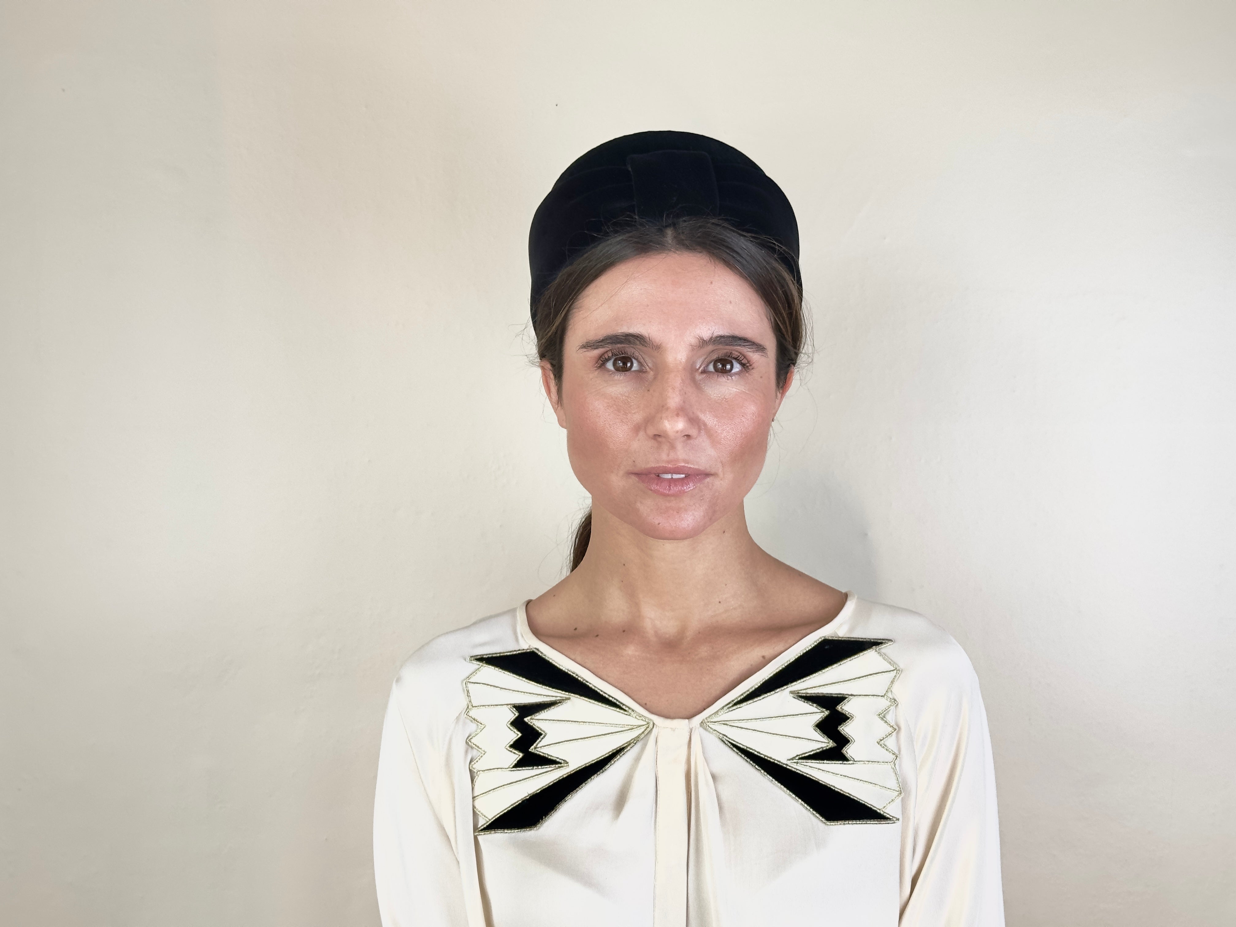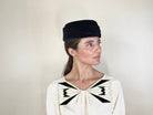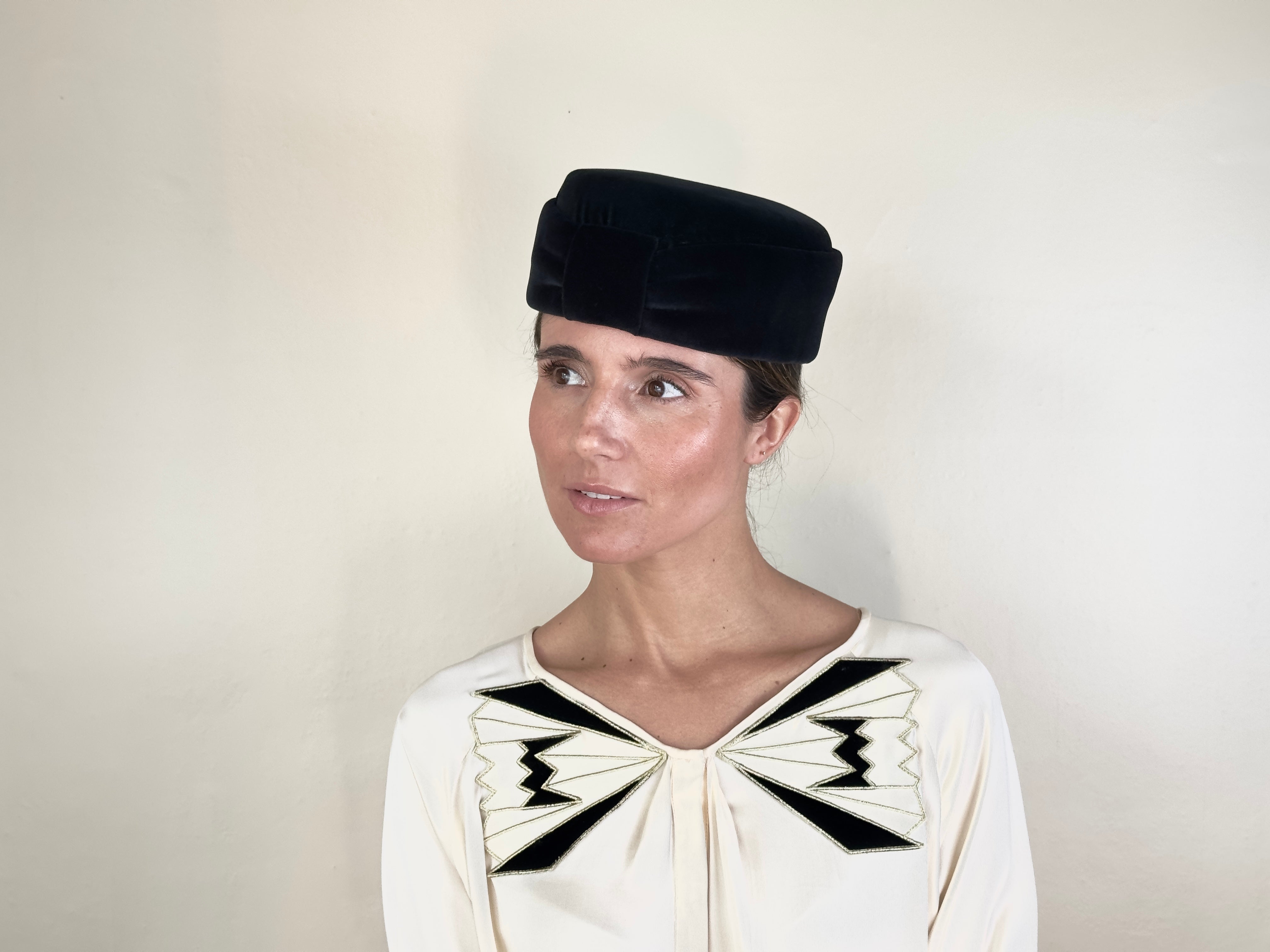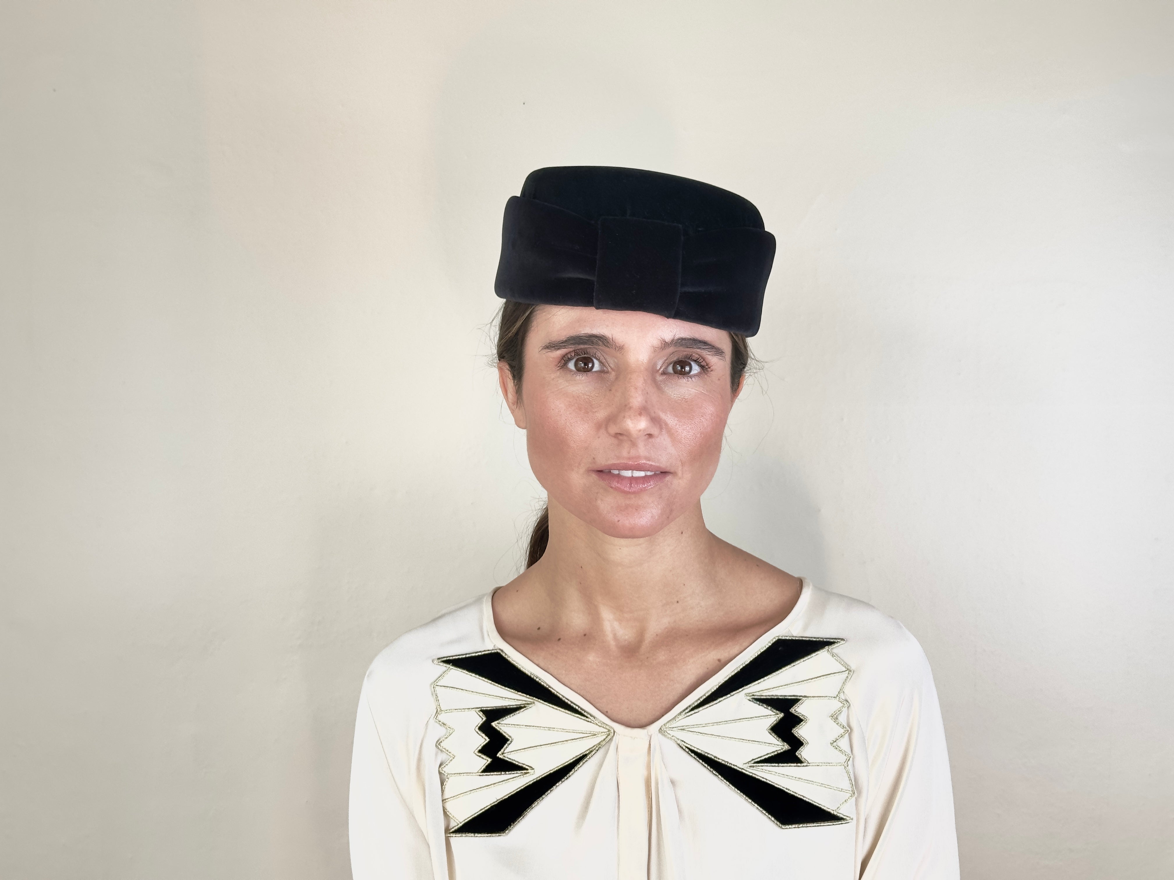 Casquete de terciopelo de algodón color negro. Pillbox con distintas posiciones.