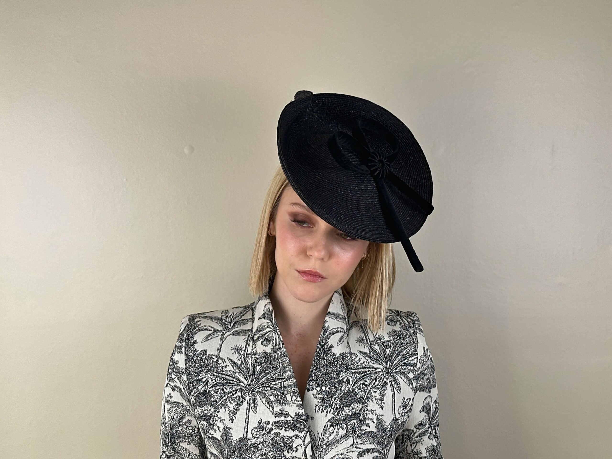 Black wheat straw headdress with velvet decoration. The plate features minimalist lines that provide simplicity and elegance, perfect for stylizing by providing visual diagonals that elevate the figure.