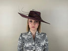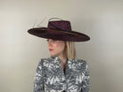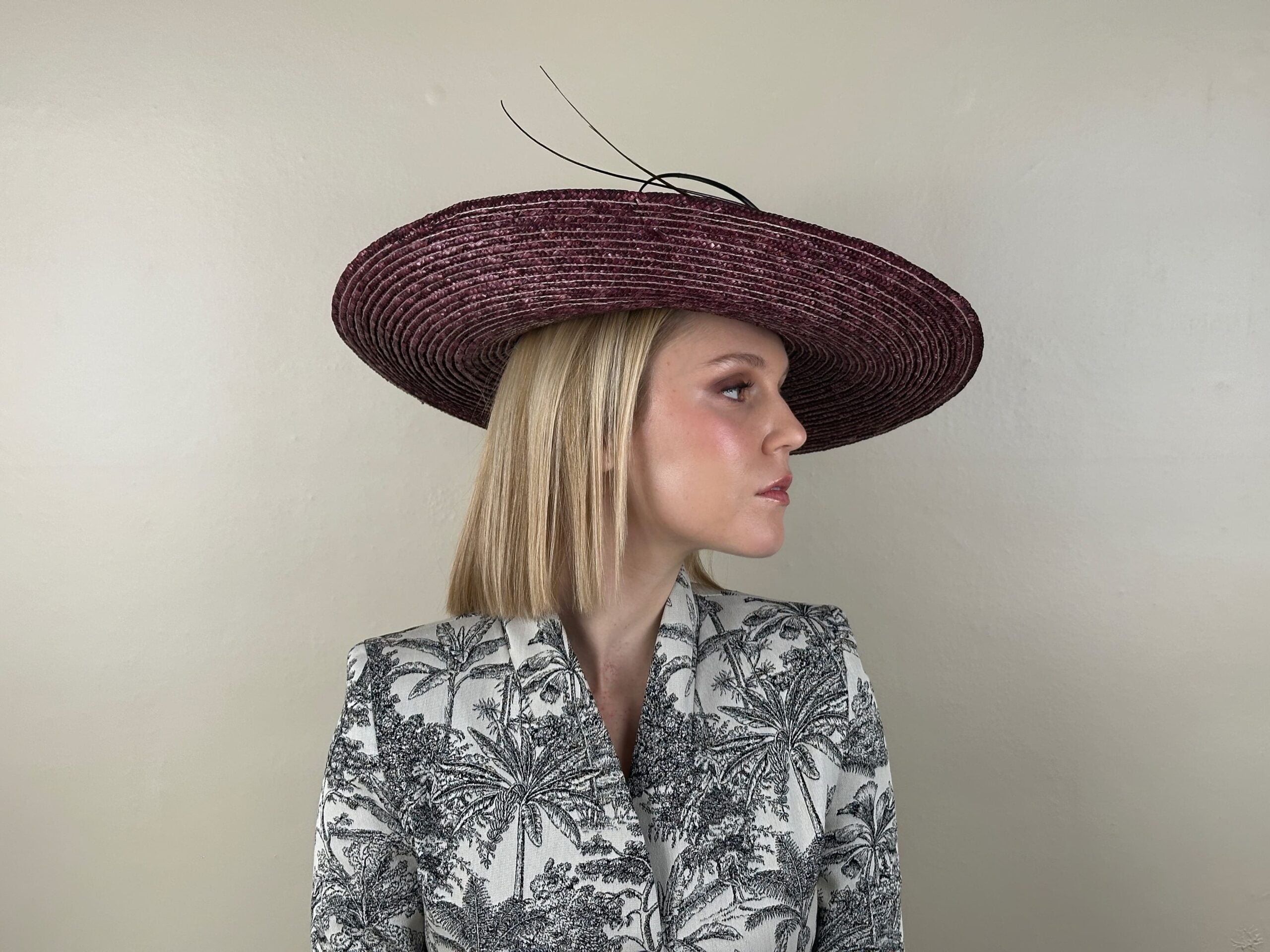 Burgundy-colored braided straw hat decorated with three rachises in brown, eggplant, and black. Conical crown with a half-turned brim.