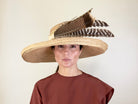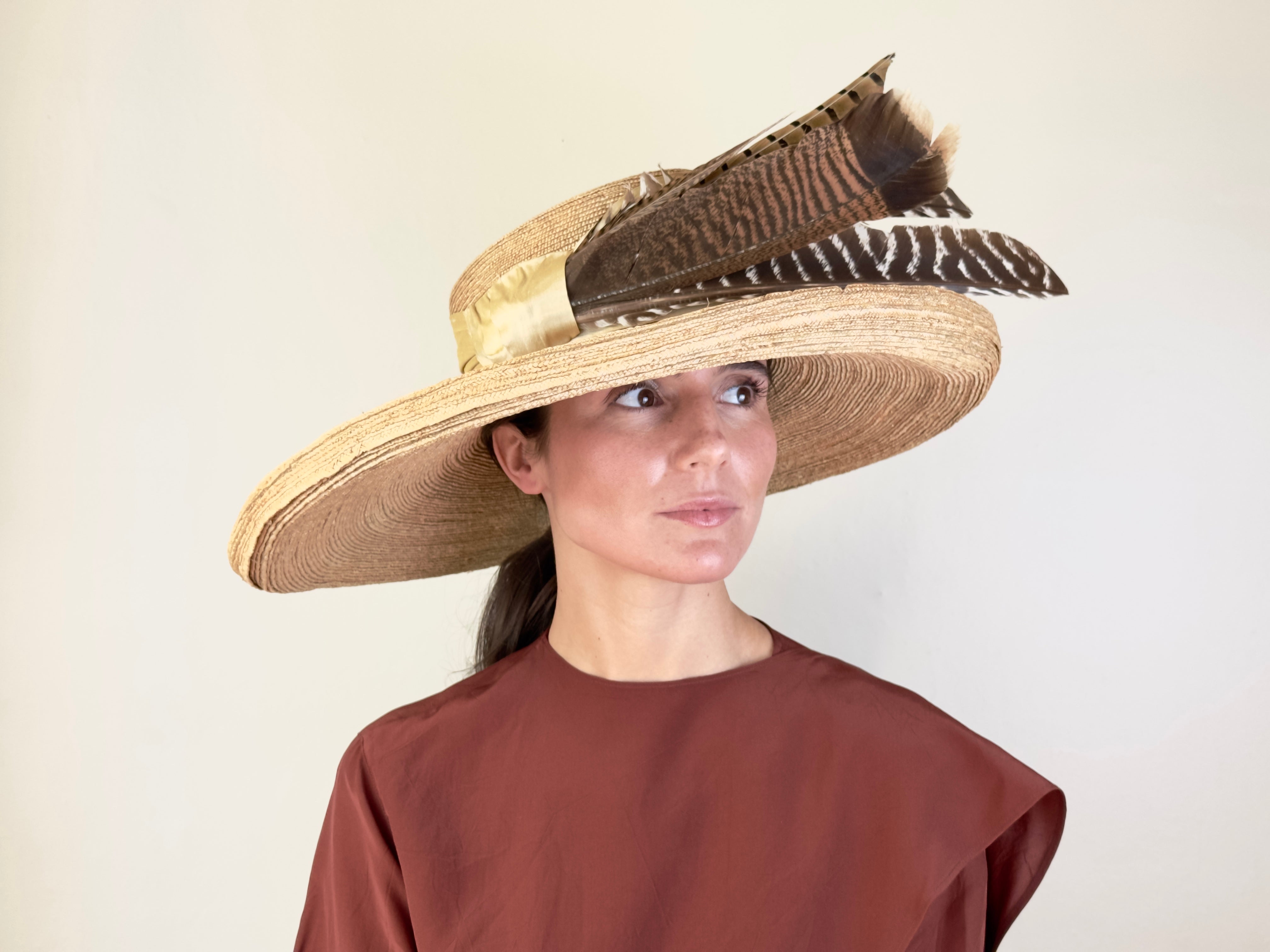 Natural-colored sewn straw hat decorated with a wild silk bow and feather appliqué.