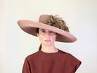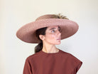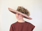Sewn straw hat in nude color decorated with feathers.