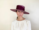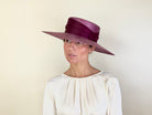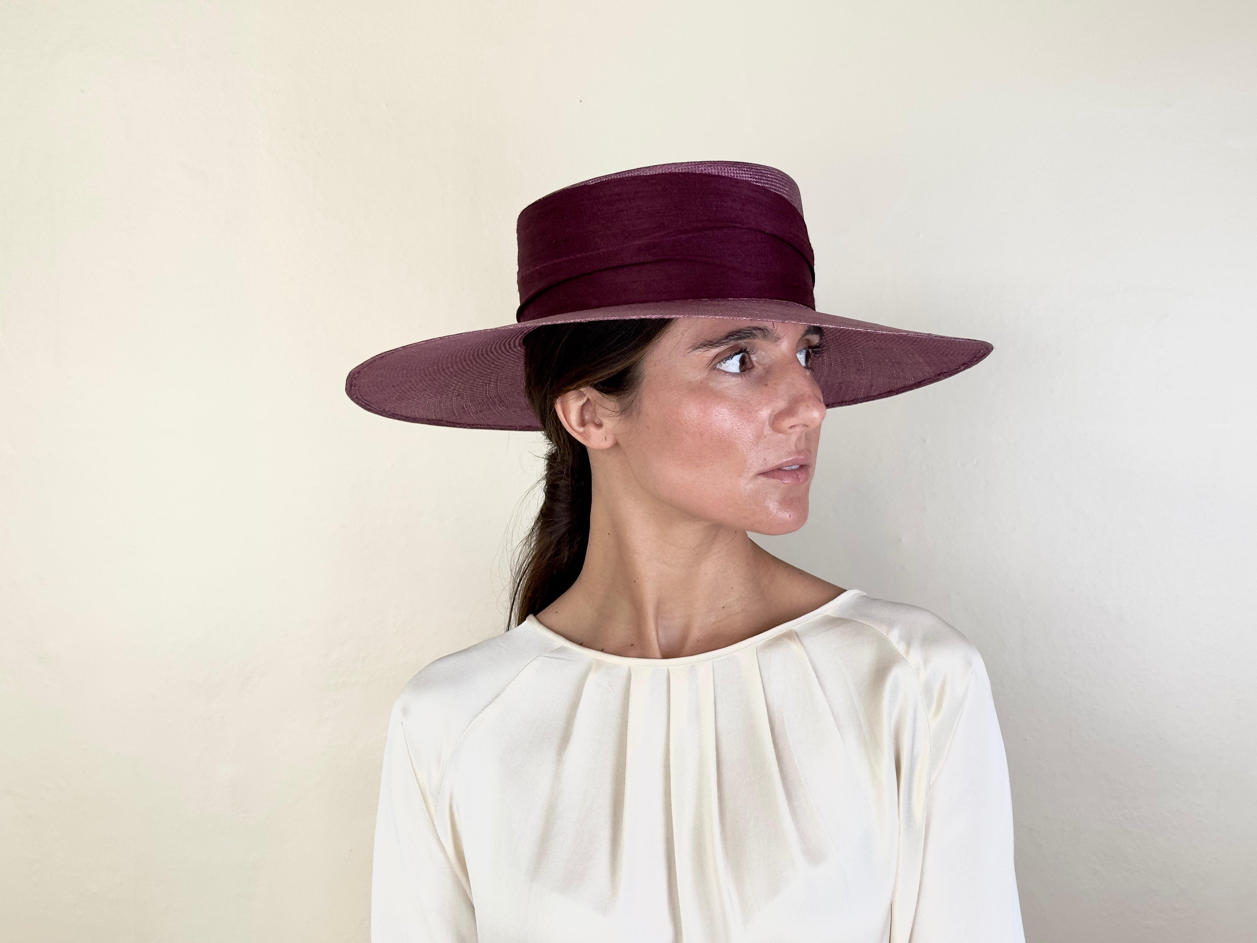 Pamela de parasisal en color violeta decorada con organza de seda rústica color vino oscuro.