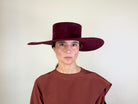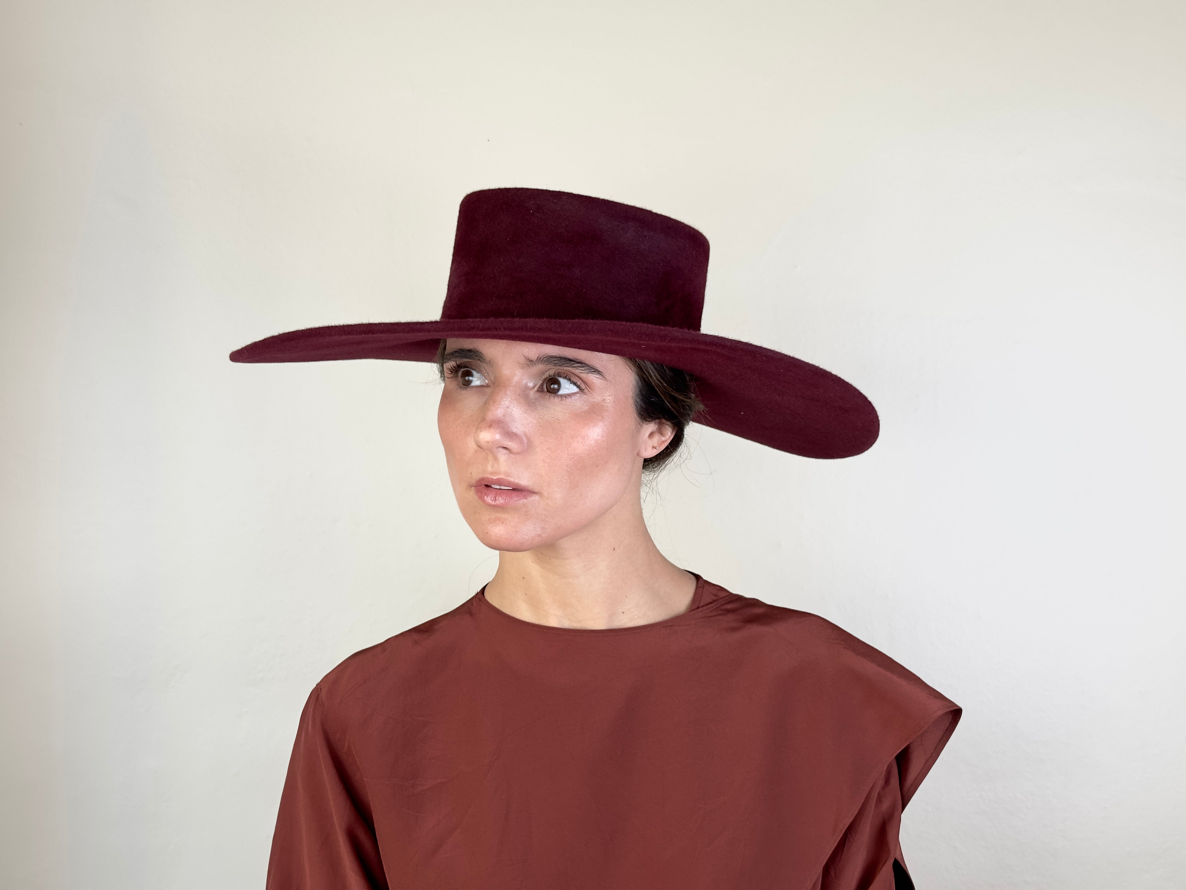 Fur felt hat with a round crown and wide brim. Velvety finish.