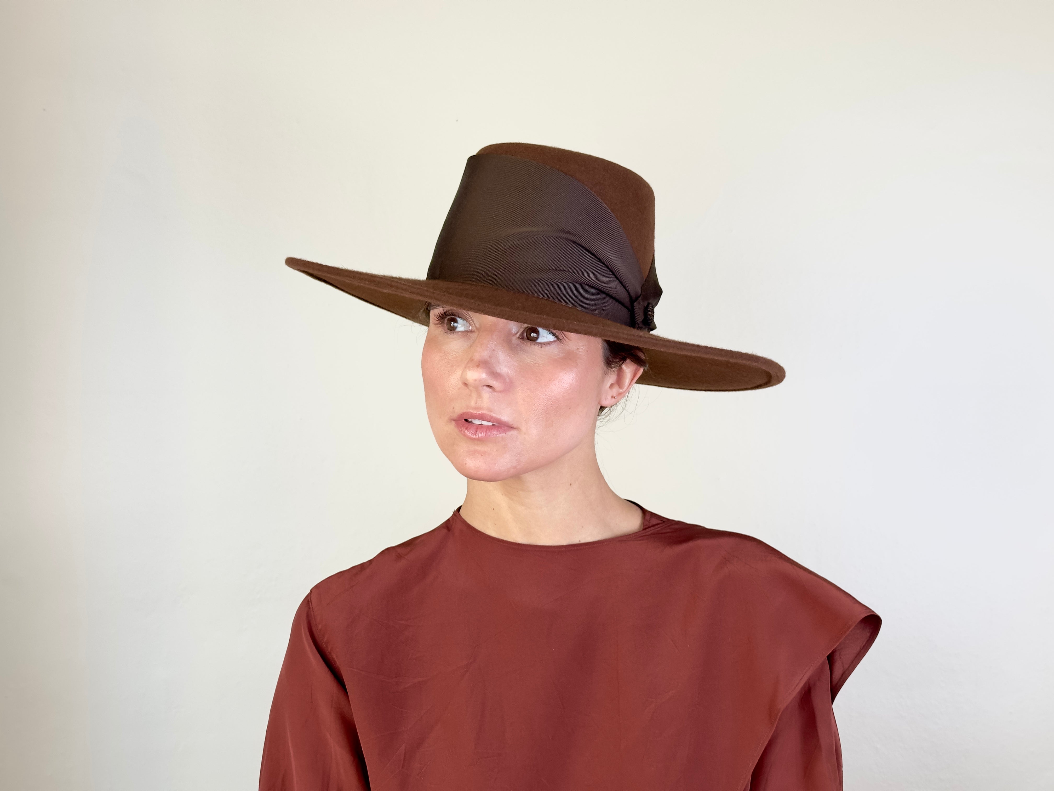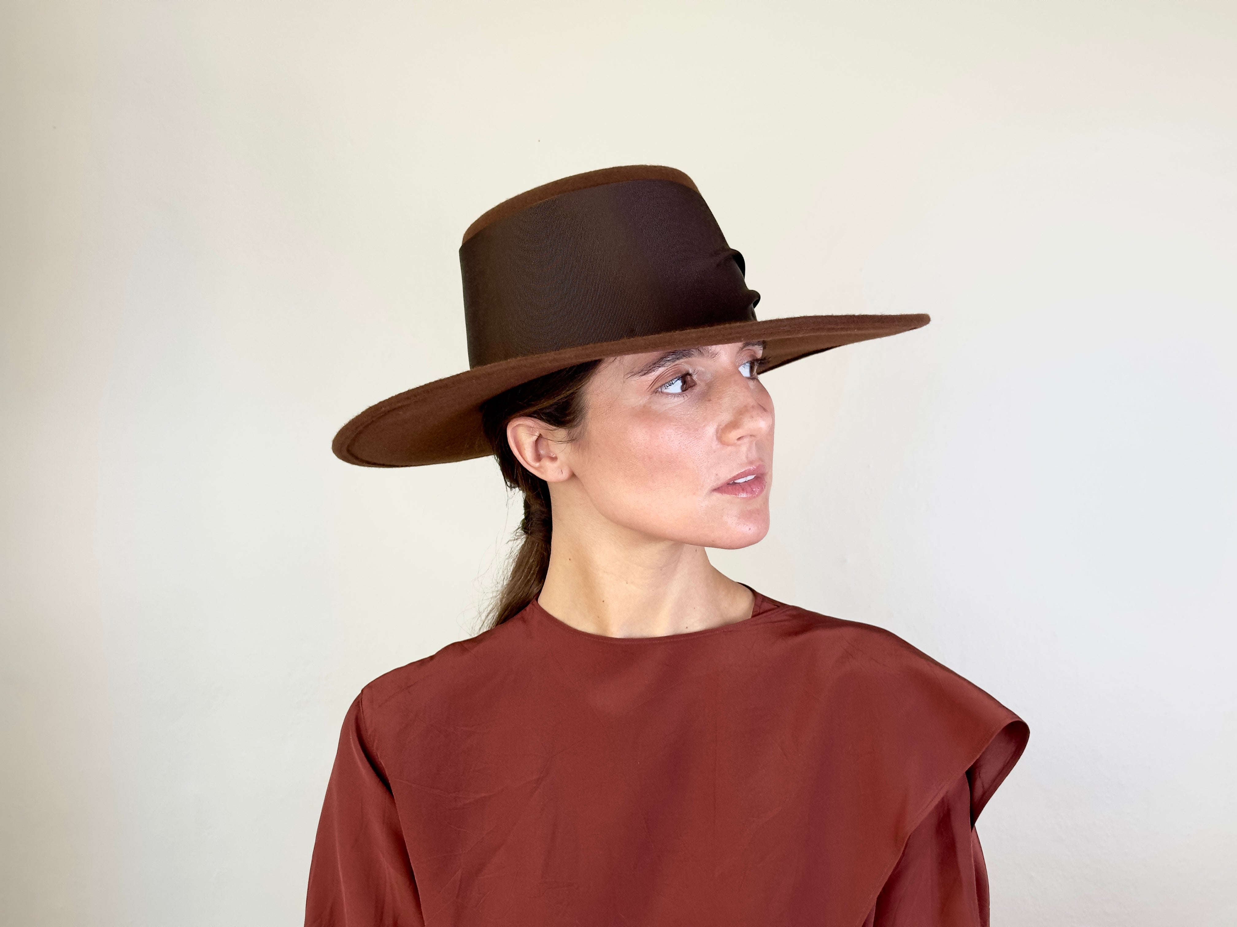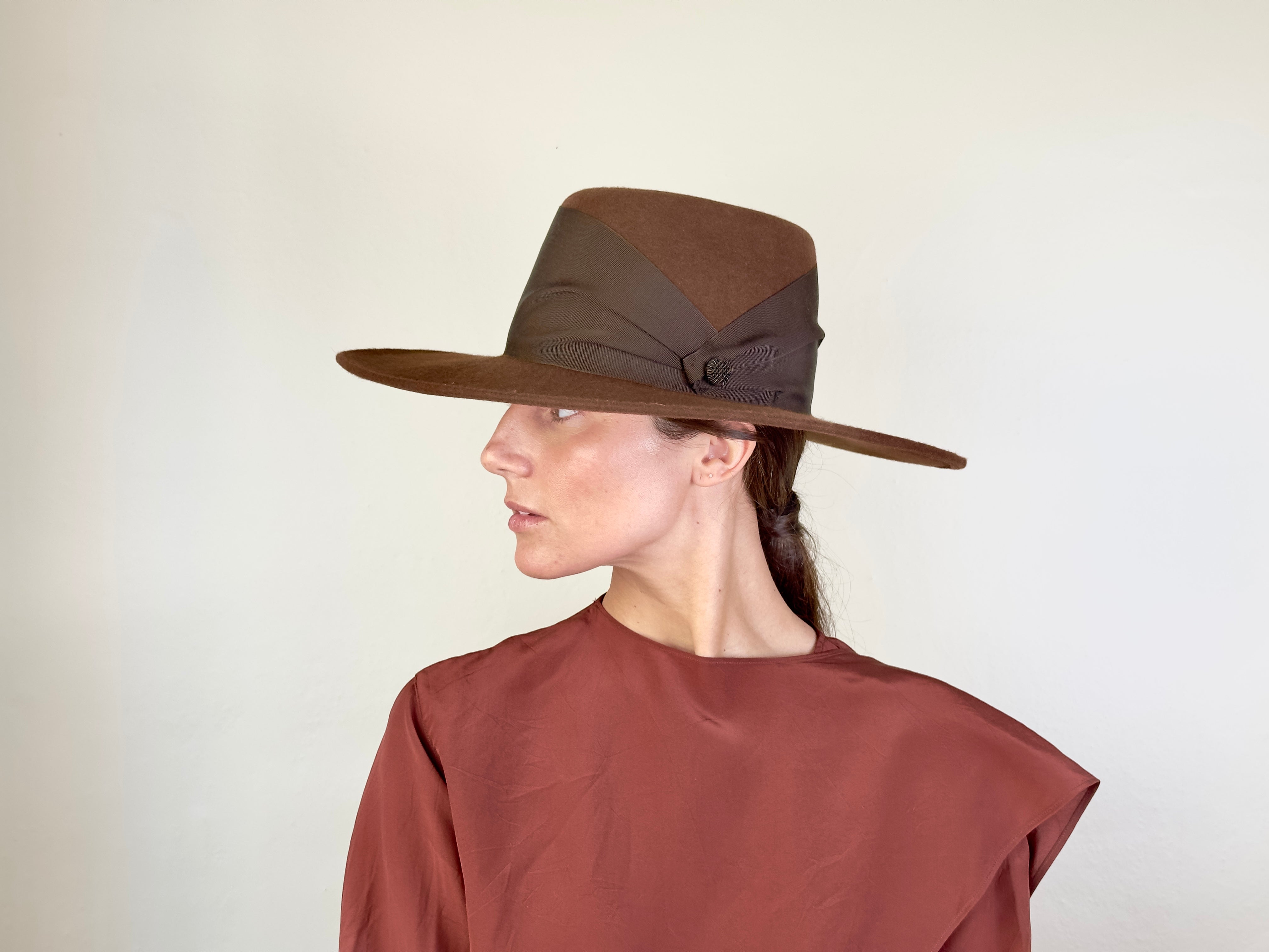 Sombre de fieltro color marrón decorada con cinta de gros grain ancha y botón marrón.