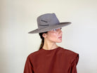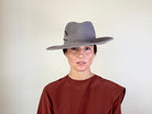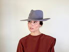 Sombrero de fieltro de pelo color gris marengo con detalle de piedras negras de cristal. Media ala vuelta y copa fedora.