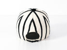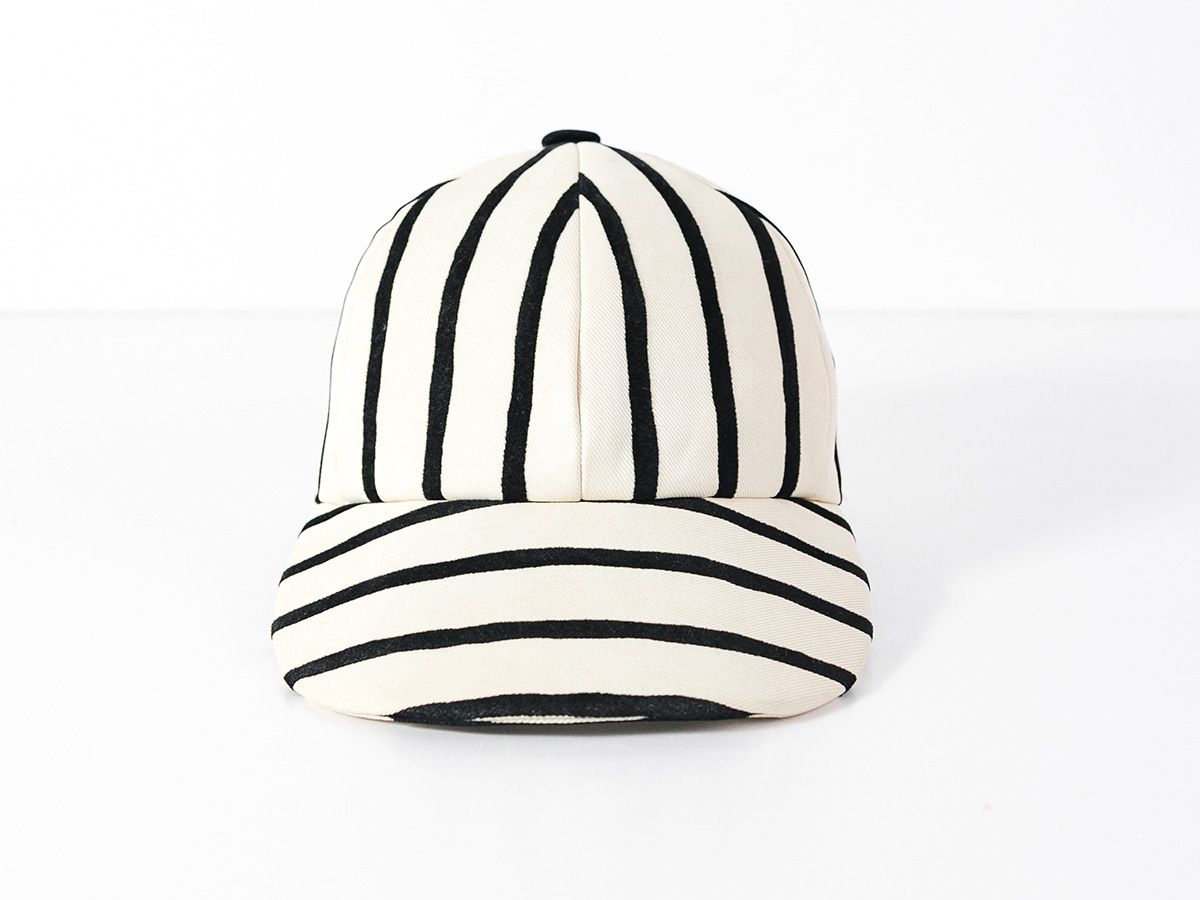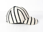 Ecru baseball-style cap with black velvet stripes. Lined with organic cotton.