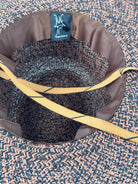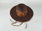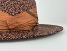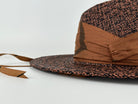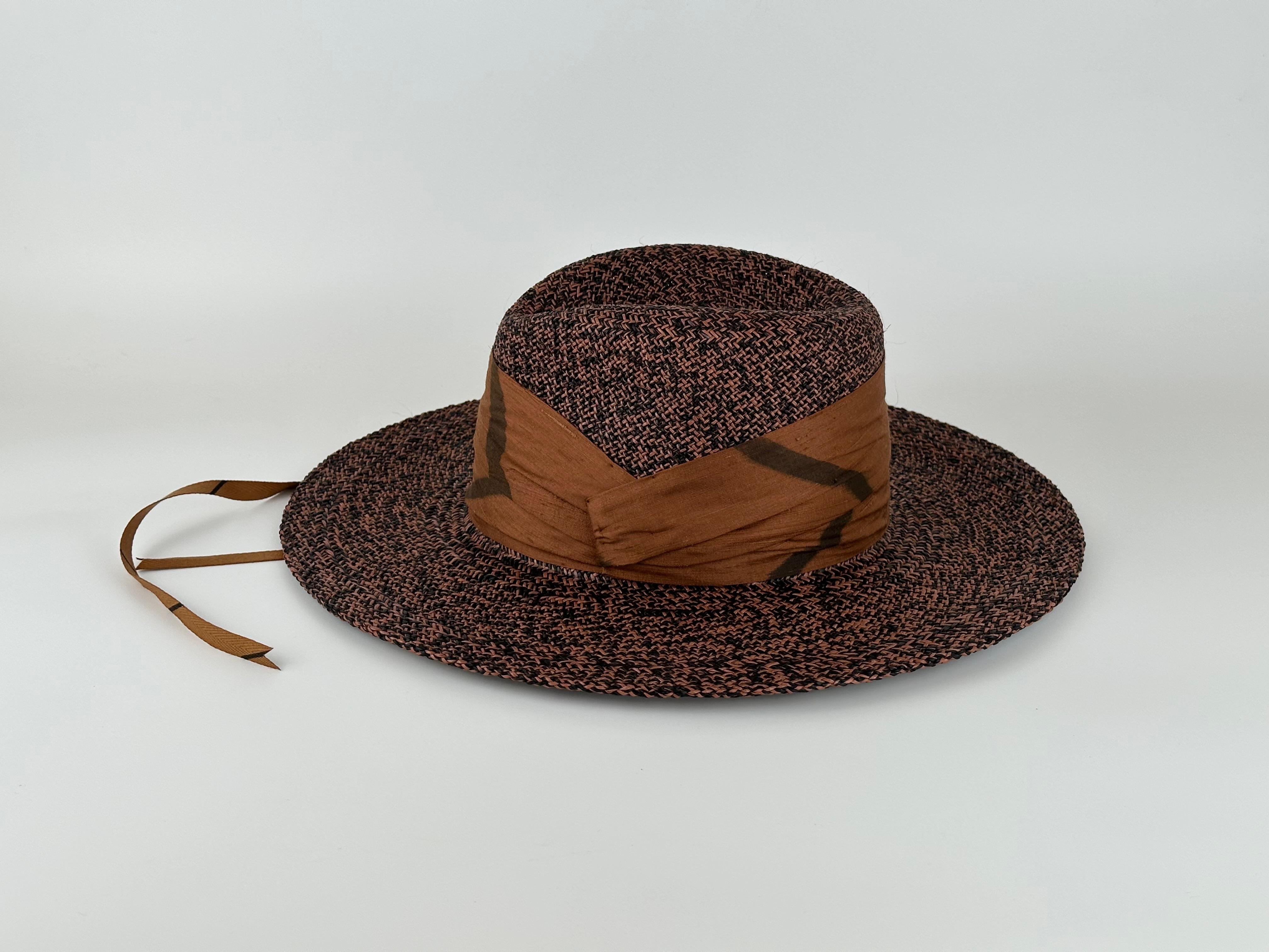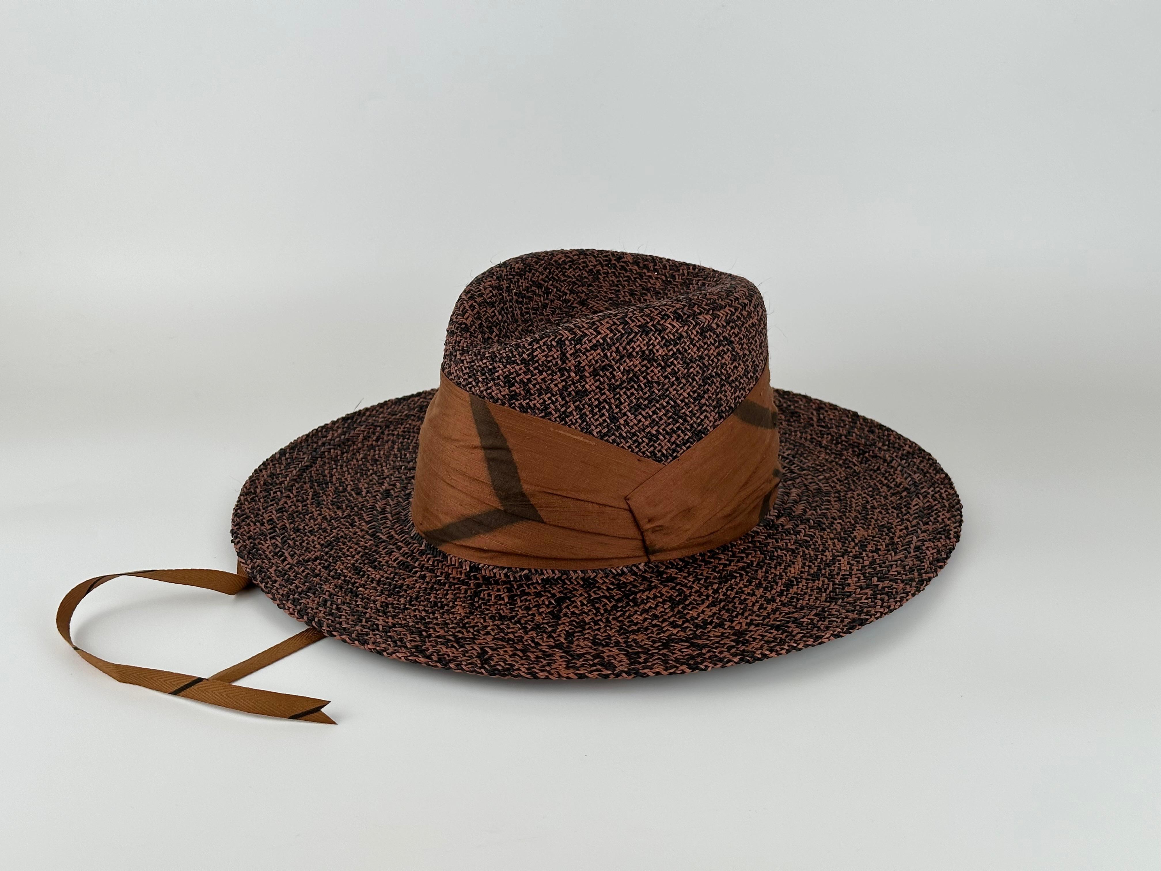 A two-tone rust-brown and black Panama hat decorated with a painted wild silk ribbon. It features a removable painted striped cotton ribbon that you can use to tie or hang on your back.