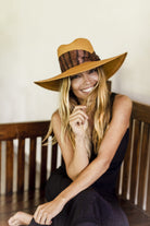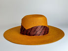 A mustard-colored version of a toquilla straw fedora top hat (Panama Hat DO) with a hand-dyed and painted straw and silk ribbon.