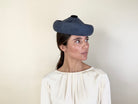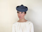 Tocado de fieltro de pelo color azul empolvado efecto oxidado. Inspirado en el sombrero calañés, con botón de terciopelo negro.