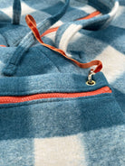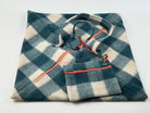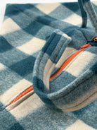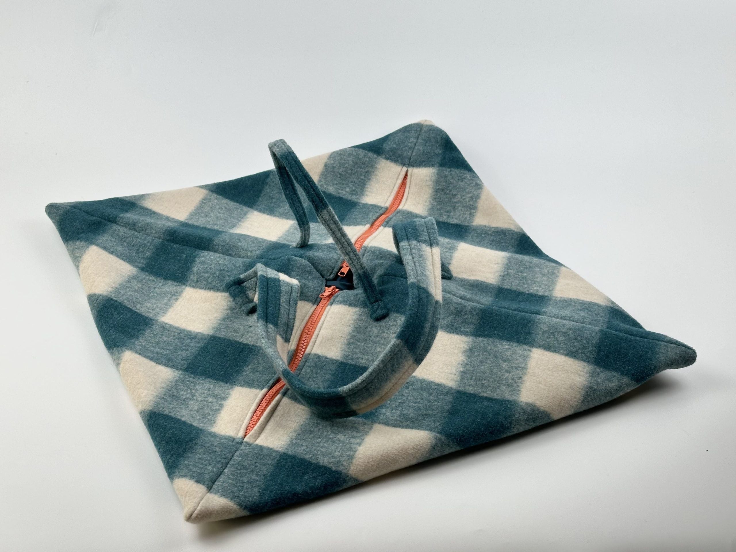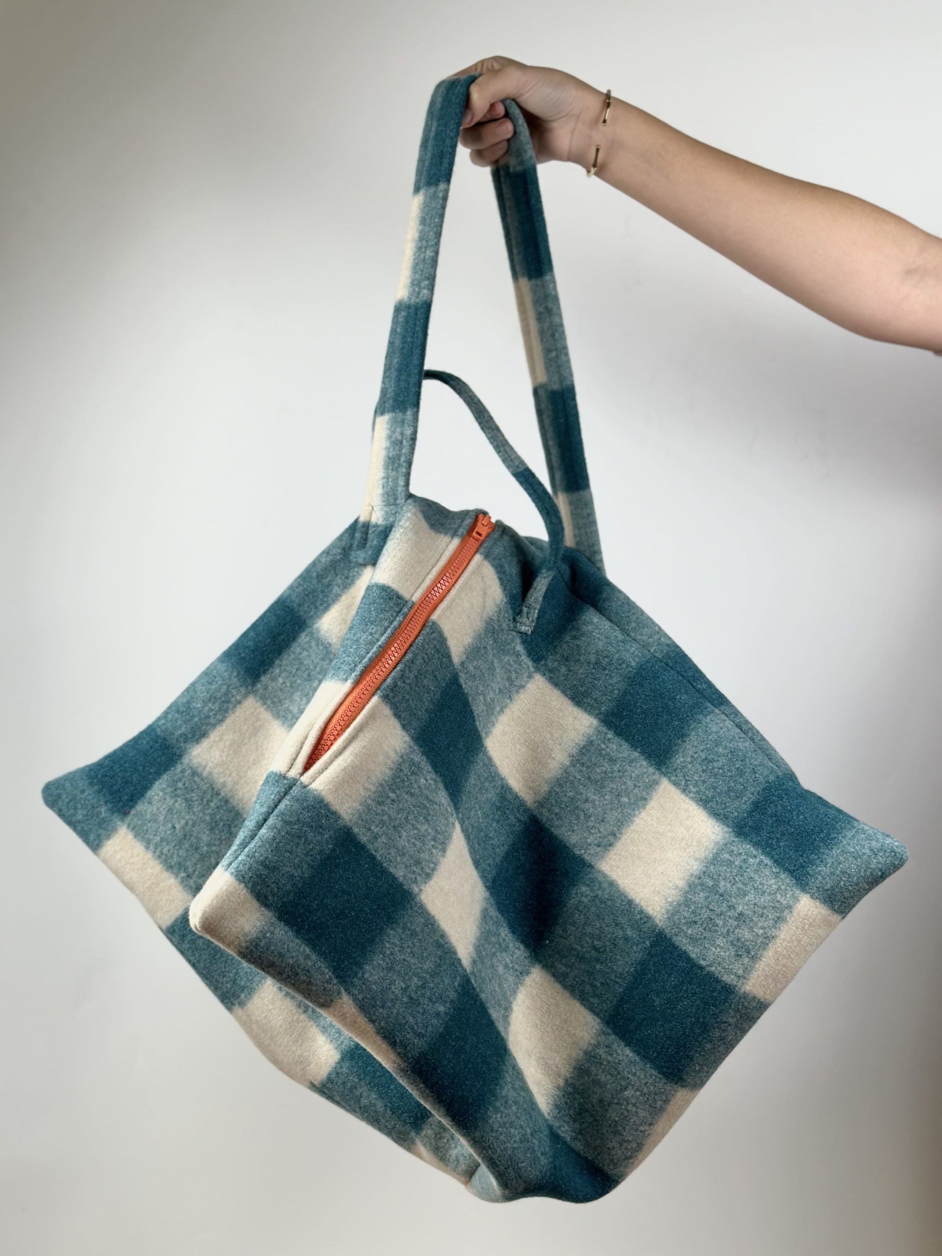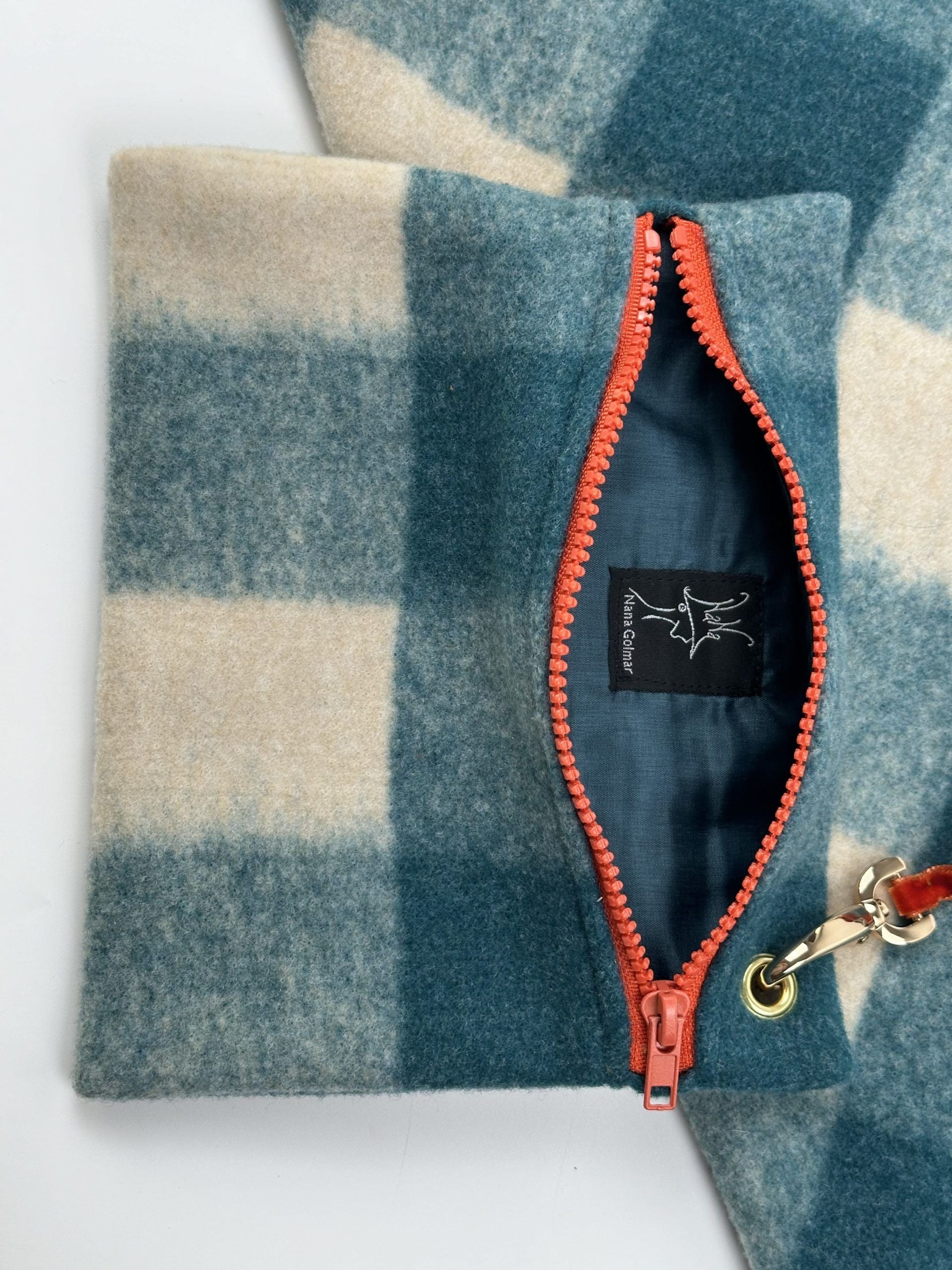 Geometric white and green checkered bag with orange zippers. Made of boiled wool.