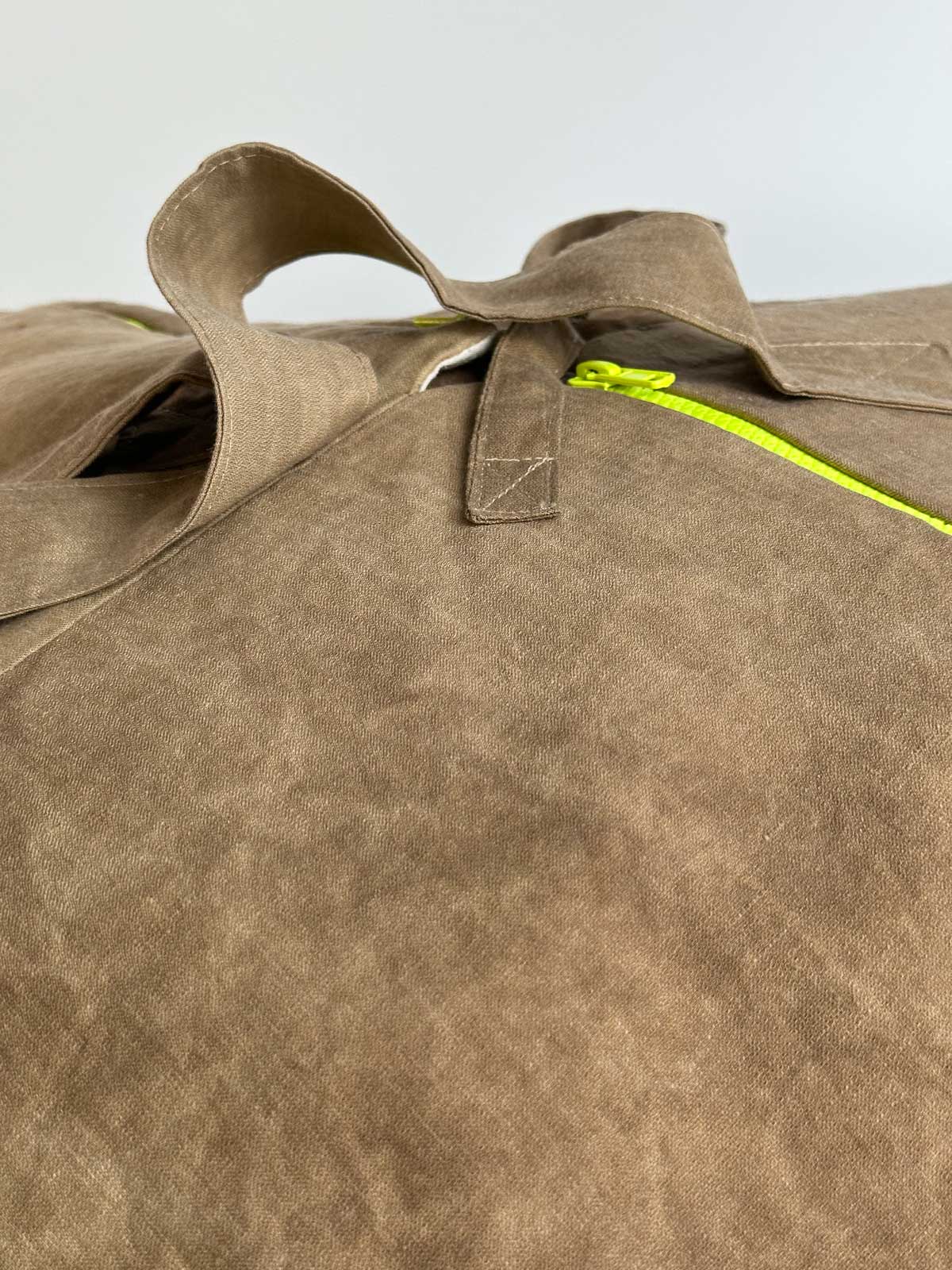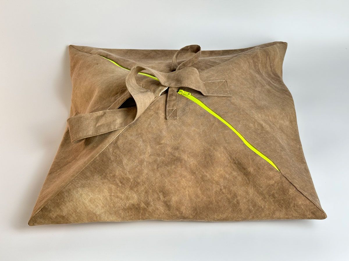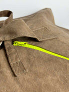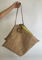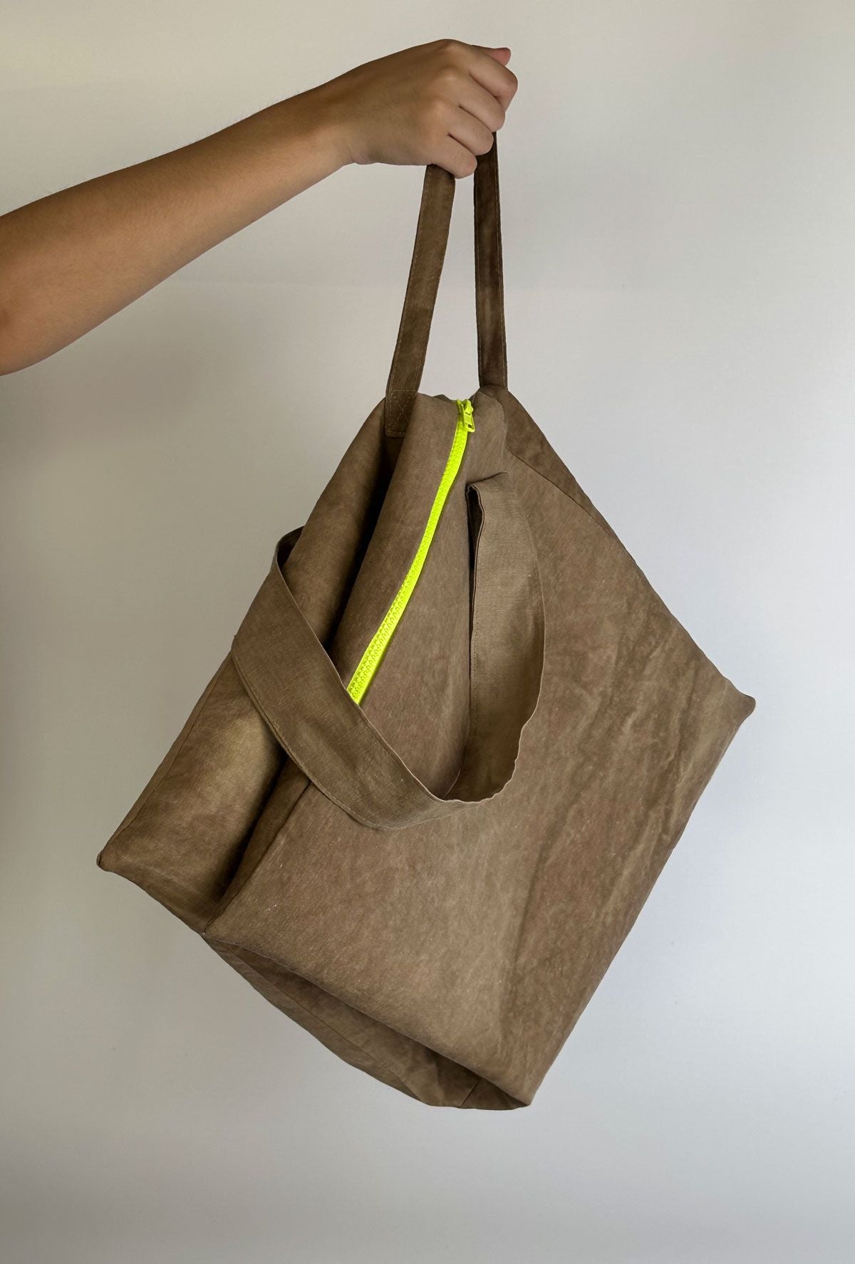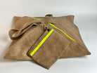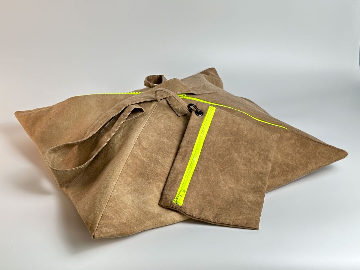 Geometric beige linen bag with fluorescent yellow zippers. It has two handles at different heights.