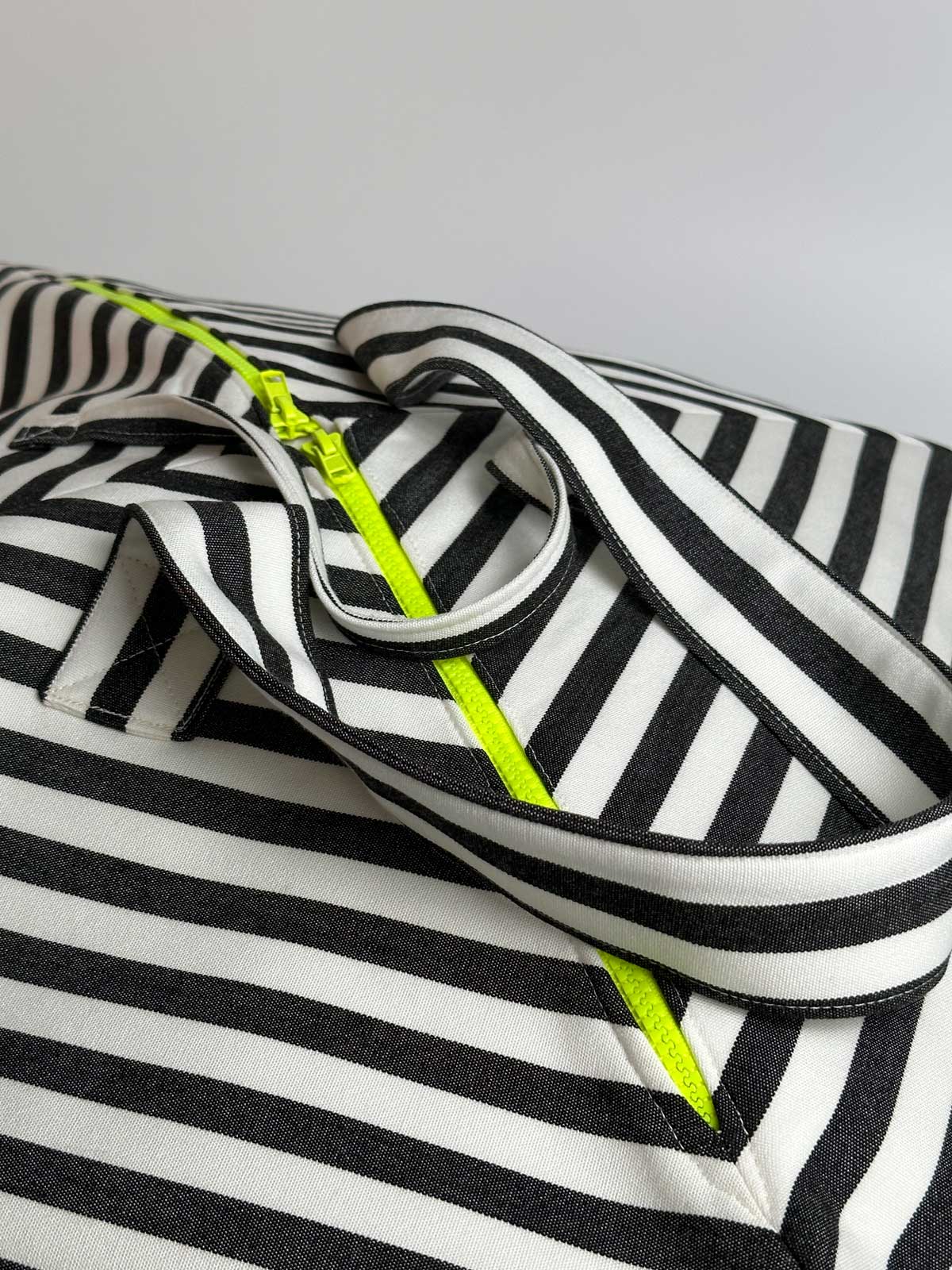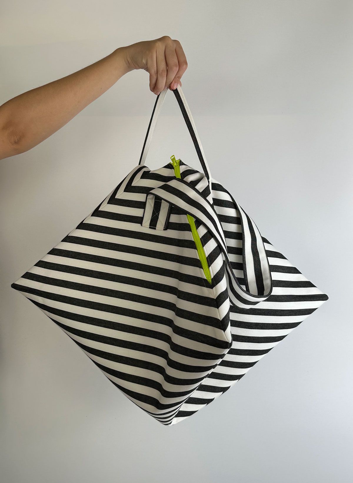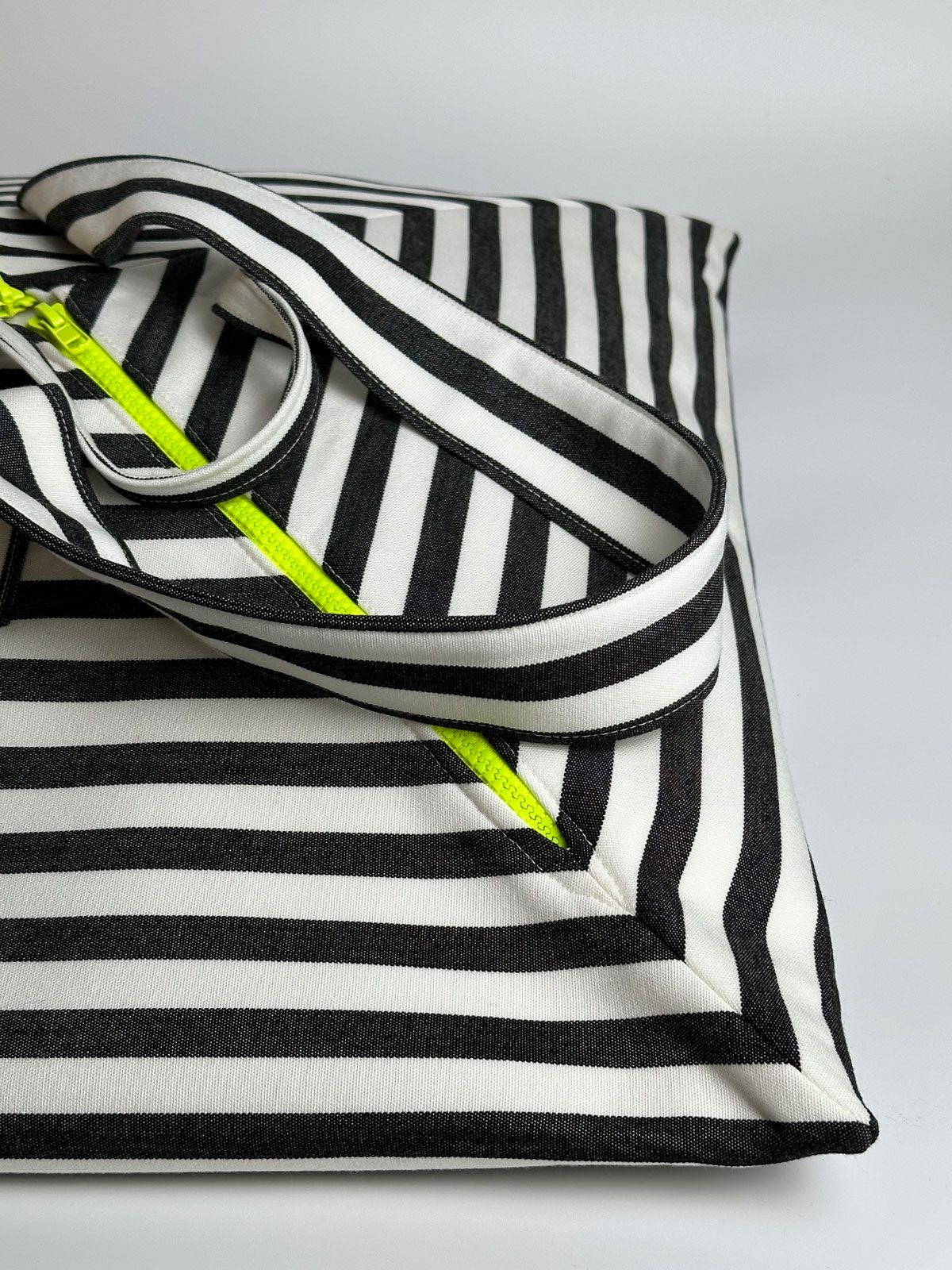 Geometric striped bag with fluorescent yellow zippers. Made of water-resistant, water-repellent cotton.