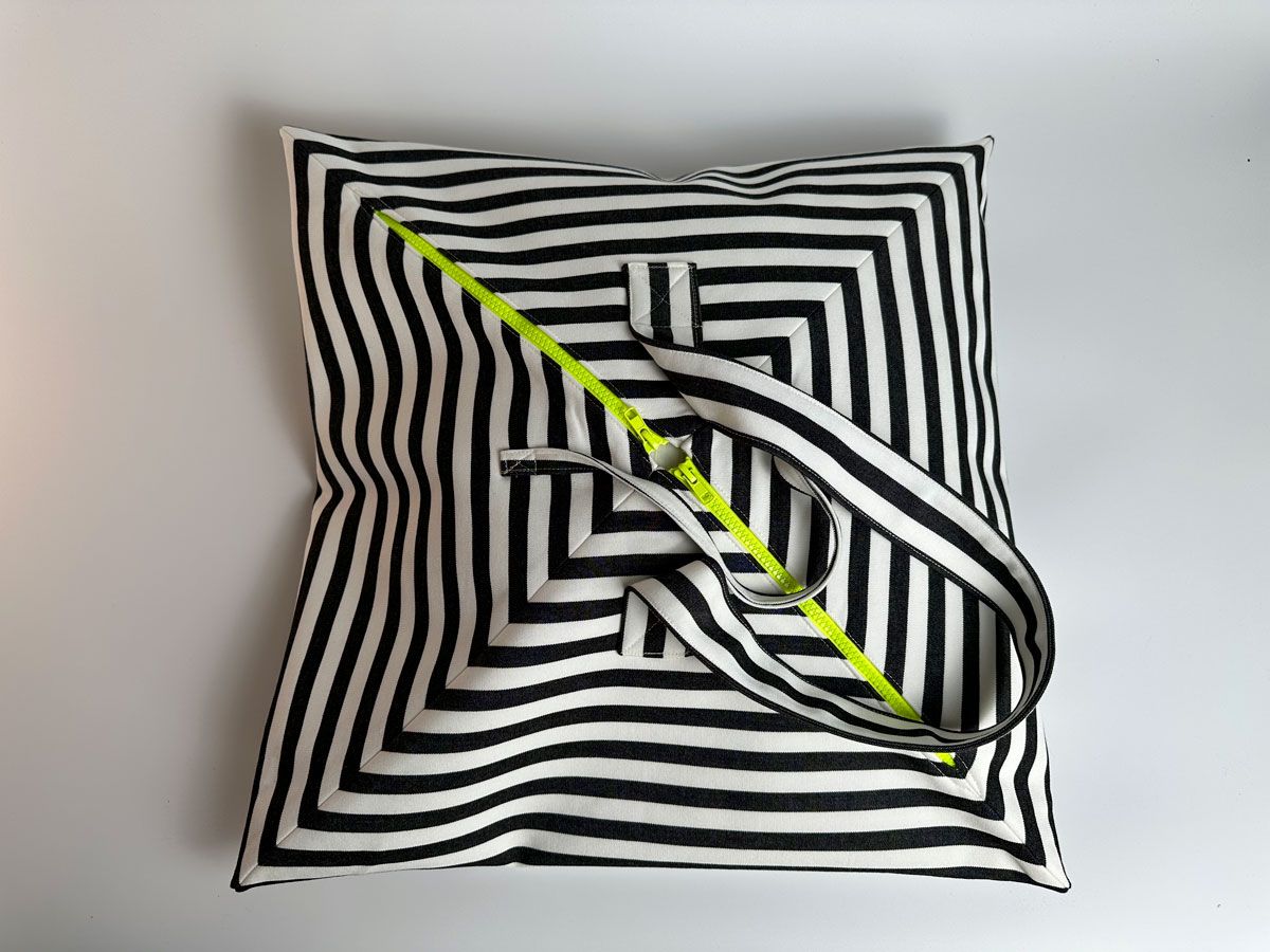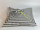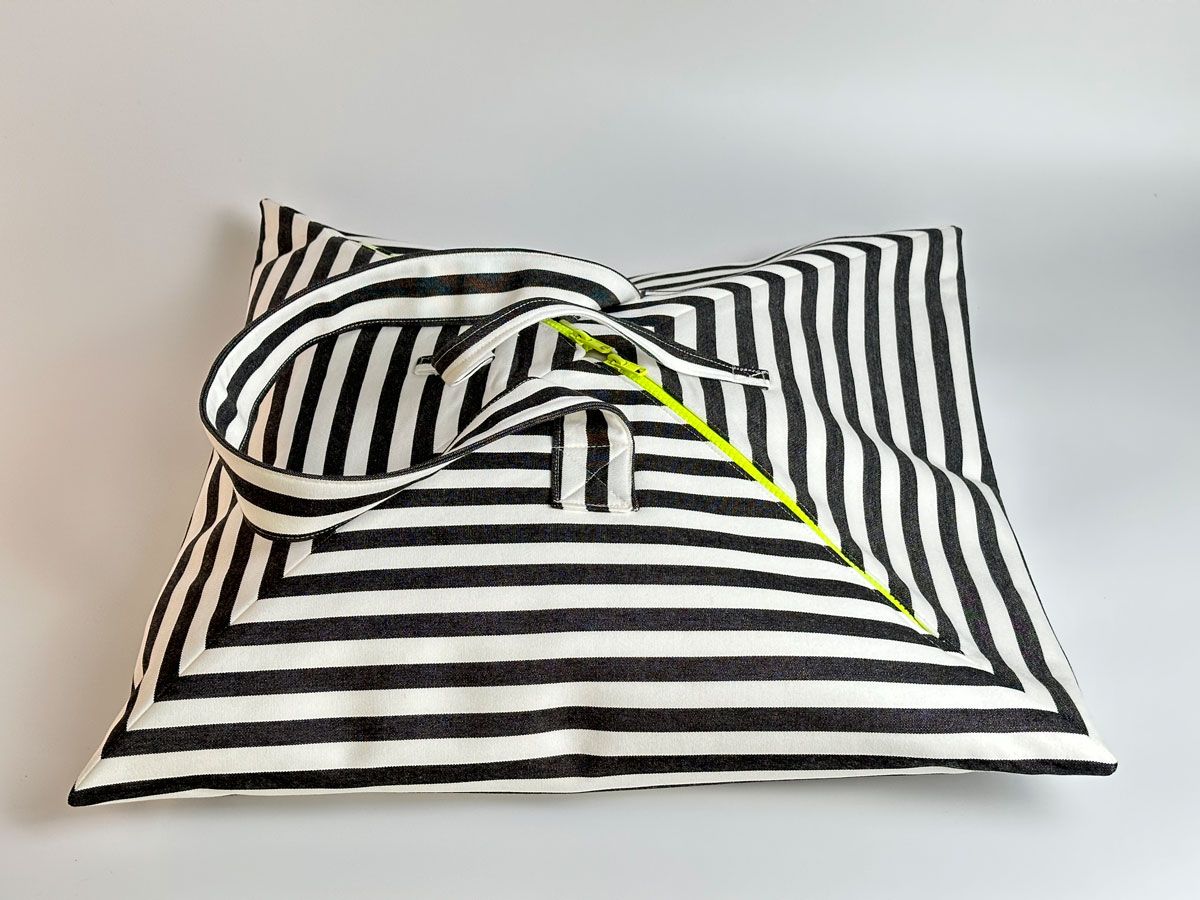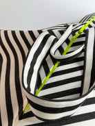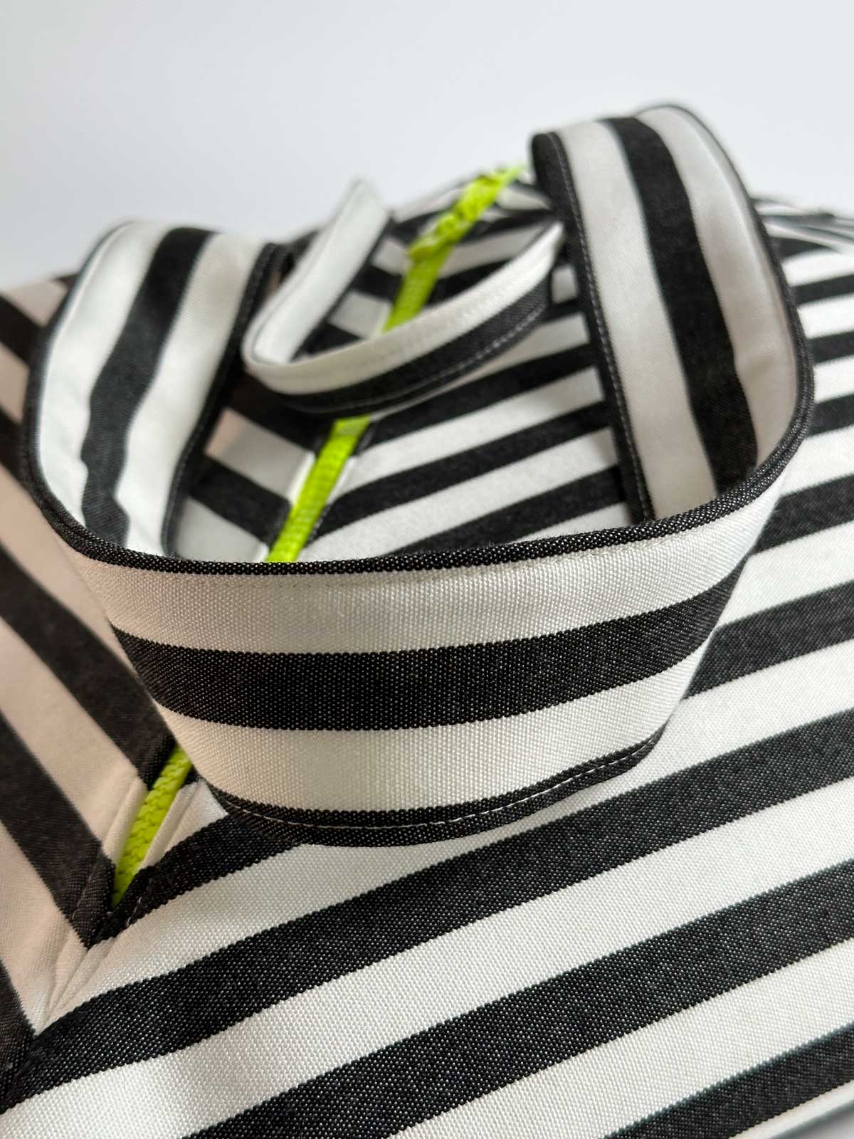 Geometric striped bag with fluorescent yellow zippers. Made of water-resistant, water-repellent cotton.