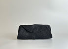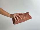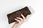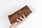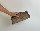 Hand-stitched, with interior reinforcements that provide flexibility and durability while remaining lightweight. Its shape is designed to fit the shape of a hand, making it extremely comfortable despite being a handbag. Magnetic closure.