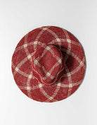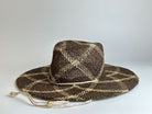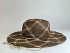 Checkered seagrass straw hat with a fedora crown and wide brim. It features a natural rope chin strap to hold it in place when it's windy or to wear across the back.