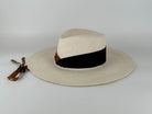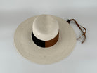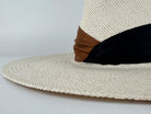 Ecru-colored toquilla straw fedora (Panama Hat DO) decorated with a two-tone rust-brown and black silk ribbon. It has a removable, painted striped cotton ribbon that you can use to tie it around your neck or hang it on your back.