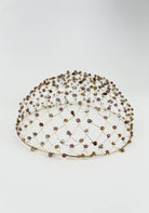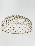 Made of gold wire and faceted crystal stones in purple and amber tones with an iridescent effect, creating an original latticework. A light and comfortable headpiece that will be the ideal accessory for both morning and evening events, for both guests and brides. Secured with hairpins.