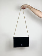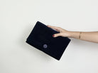 Cartera de terciopelo de algodón color azul marino. Decorada con botón al tono.
